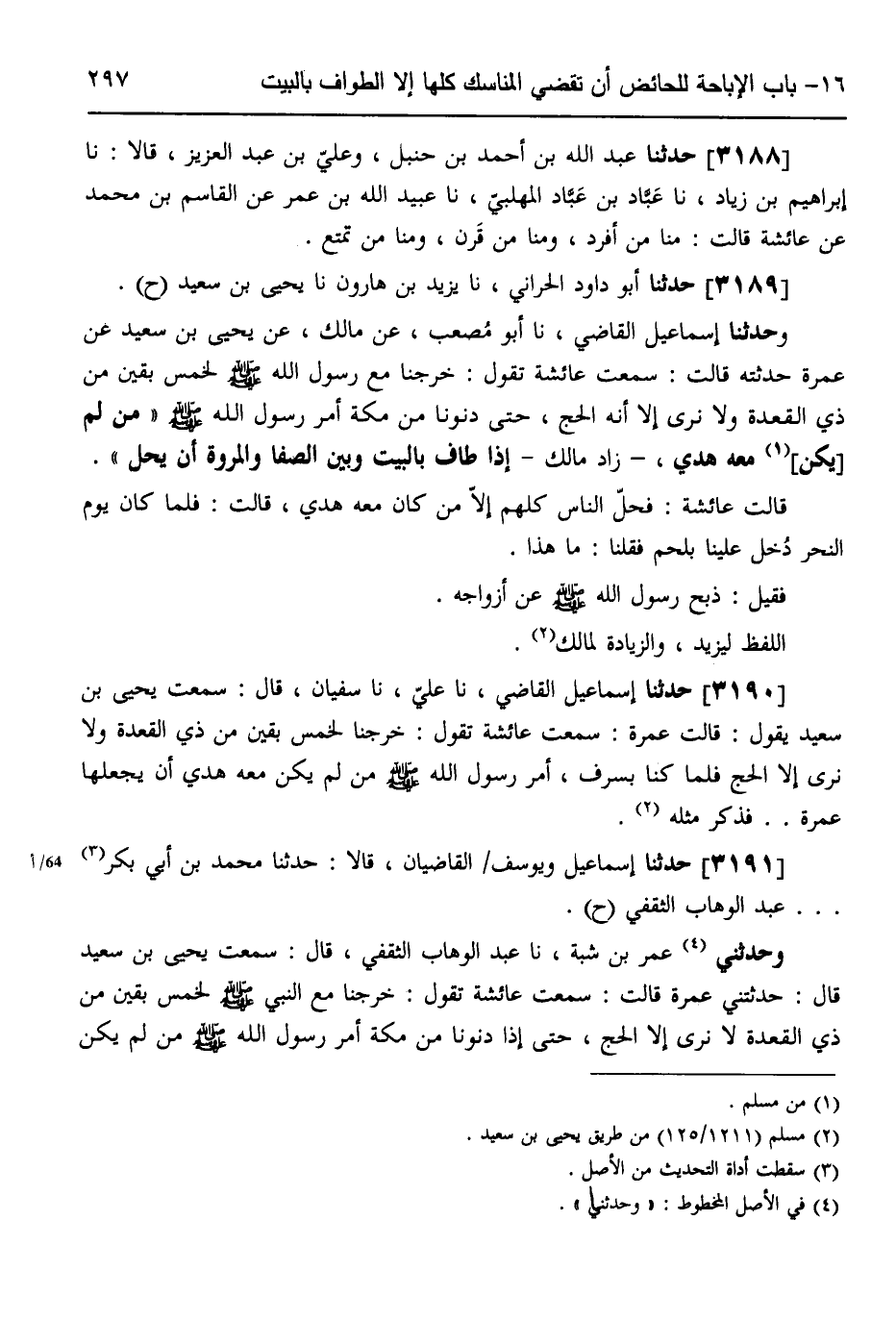 3188 - حَدَّثَنَا عَبْدُ اللَّهِ بْنُ أَحْمَدَ بْنِ حَنْبَلٍ، وَعَلِيُّ بْنُ عَبْدِ الْعَزِيزِ، قَالَا: نَا إِبْرَاهِيمُ بْنُ زِيَادٍ، نَا عَبَّادُ بْنُ عَبَّادٍ الْمُهَلَّبِيُّ، نَا عُبَيْدُ اللَّهِ بْنُ عُمَرَ، عَنِ الْقَاسِمِ بْنِ مُحَمَّدٍ،، عَنْ عَائِشَةَ قَالَتْ: «§مِنَّا مَنْ أَفْرَدَ، وَمِنَّا مَنْ قَرَنَ، وَمِنَّا مَنْ تَمَتَّعَ»