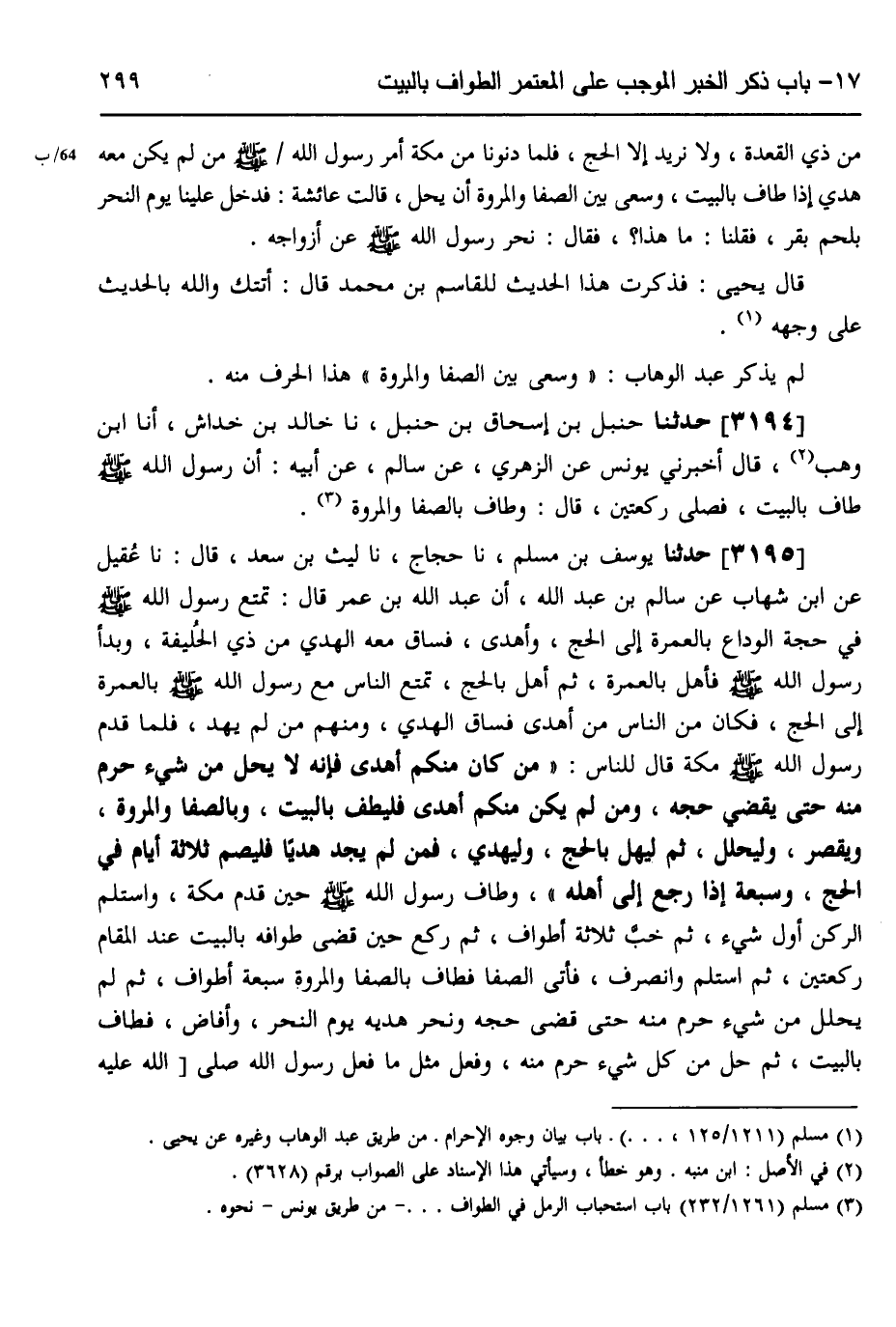 3195 - حَدَّثَنَا يُوسُفُ بْنُ مُسْلِمٍ، نَا حَجَّاجٌ، نَا لَيْثُ بْنُ سَعْدٍ، قَالَ: نَا عُقَيْلٌ، عَنِ ابْنِ شِهَابٍ، عَنْ سَالِمِ بْنِ عَبْدِ اللَّهِ، أَنَّ عَبْدَ اللَّهِ بْنَ عُمَرَ قَالَ: تَمَتَّعَ رَسُولُ اللَّهِ صَلَّى اللهُ عَلَيْهِ وَسَلَّمَ فِي حَجَّةِ الْوَدَاعِ بِالْعُمْرَةِ إِلَى الْحَجِّ وَأَهْدَى، فَسَاقَ مَعَهُ الْهَدْيَ مِنْ ذِي الْحُلَيْفَةِ، وَبَدَأَ رَسُولُ اللَّهِ صَلَّى اللهُ عَلَيْهِ وَسَلَّمَ فَأَهَلَّ بِالْعُمْرَةِ، ثُمَّ أَهَلَّ بِالْحَجِّ، تَمَتَّعَ النَّاسُ مَعَ رَسُولِ اللَّهِ صَلَّى اللهُ عَلَيْهِ وَسَلَّمَ بِالْعُمْرَةِ إِلَى الْحَجِّ فَكَانَ مِنَ النَّاسِ مَنْ أَهْدَى فَسَاقَ الْهَدْيَ، وَمِنْهُمْ مَنْ لَمْ يُهْدِ، فَلَمَّا قَدِمَ رَسُولُ اللَّهِ صَلَّى اللهُ عَلَيْهِ وَسَلَّمَ مَكَّةَ قَالَ لِلنَّاسِ: «§مَنْ كَانَ مِنْكُمْ أَهْدَى فَإِنَّهُ لَا يَحِلُّ مِنْ شَيْءٍ حَرُمَ مِنْهُ حَتَّى يَقْضِيَ حَجَّهُ، وَمَنْ لَمْ يَكُنْ مِنْكُمْ أَهْدَى فَلْيَطُفْ بِالْبَيْتِ وَبِالصَّفَا وَالْمَرْوَةِ وَيُقَصِّرْ وَلْيَحْلِلْ، ثُمَّ لِيُهِلَّ بِالْحَجِّ وَلْيُهْدِ، فَمَنْ لَمْ يَجِدْ هَدْيًا فَلْيَصُمْ ثَلَاثَةَ أَيَّامٍ فِي الْحَجِّ وَسَبْعَةً إِذَا رَجَعَ إِلَى أَهْلِهِ» وَطَافَ رَسُولُ اللَّهِ صَلَّى اللهُ عَلَيْهِ وَسَلَّمَ حِينَ قَدِمَ مَكَّةَ وَاسْتَلَمَ الرُّكْنَ أَوَّلَ شَيْءٍ، ثُمَّ خَبَّ ثَلَاثَةَ أَطْوَافٍ، ثُمَّ رَكَعَ حِينَ قَضَى طَوَافَهُ بِالْبَيْتِ عِنْدَ الْمَقَامِ رَكْعَتَيْنِ، ثُمَّ اسْتَلَمَ وَانْصَرَفَ، فَأَتَى الصَّفَا فَطَافَ بِالصَّفَا وَالْمَرْوَةِ سَبْعَةَ أَطْوَافٍ، ثُمَّ لَمْ يَحْلِلْ مِنْ شَيْءٍ حَرُمَ مِنْهُ حَتَّى قَضَى حَجَّهُ، وَنَحَرَ هَدْيَهُ يَوْمَ النَّحْرِ، وَأَفَاضَ فَطَافَ بِالْبَيْتِ، ثُمَّ حَلَّ مِنْ كُلِّ شَيْءٍ حَرُمَ مِنْهُ، وَفَعَلَ مِثْلَ مَا فَعَلَ رَسُولُ اللَّهِ صَلَّى اللهُ عَلَيْهِ وَسَلَّمَ -[300]- مَنْ أَهْدَى فَسَاقَ الْهَدْيَ مِنَ النَّاسِ،
