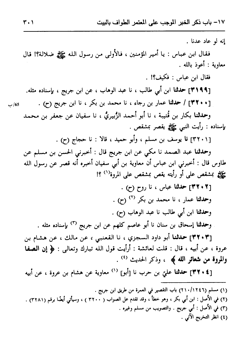 3201 - نَا يُوسُفُ بْنُ مُسْلِمٍ، وَأَبُو حُمَيْدٍ، قَالَا: نَا حَجَّاجٌ، ح وَحَدَّثَنَا عَبْدُ الصَّمَدِ، نَا مَكِّيٌّ، عَنِ ابْنِ جُرَيْجٍ قَالَ: أَخْبَرَنِي الْحَسَنُ بْنُ مُسْلِمٍ، عَنْ طَاوُسٍ قَالَ: أَخْبَرَنِي ابْنُ عَبَّاسٍ: أَنَّ مُعَاوِيَةَ بْنَ أَبِي سُفْيَانَ أَخْبَرَهُ، أَنْهَ «§قَصَّرَ عِنْدَ رَسُولِ اللَّهِ صَلَّى اللهُ عَلَيْهِ وَسَلَّمَ بِمِشْقَصٍ عَلَى - أَوْ رَأَيْتُهُ يَقُصُّ بِمِشْقَصٍ عَلَى - الْمَرْوَةِ»
