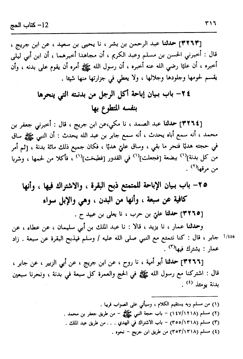 3266 - حَدَّثَنَا أَبُو أُمَيَّةَ، نَا رَوْحٌ، عَنِ ابْنِ جُرَيْجٍ، عَنْ أَبِي الزُّبَيْرِ،، عَنْ جَابِرٍ قَالَ: «§اشْتَرَكْنَا مَعَ رَسُولِ اللَّهِ صَلَّى اللهُ عَلَيْهِ وَسَلَّمَ فِي الْحَجِّ وَالْعُمْرَةِ؛ كُلُّ سَبْعَةٍ فِي بَدَنَةٍ، وَنَحَرْنَا سَبْعِينَ بَدَنَةً يَوْمَئِذٍ»