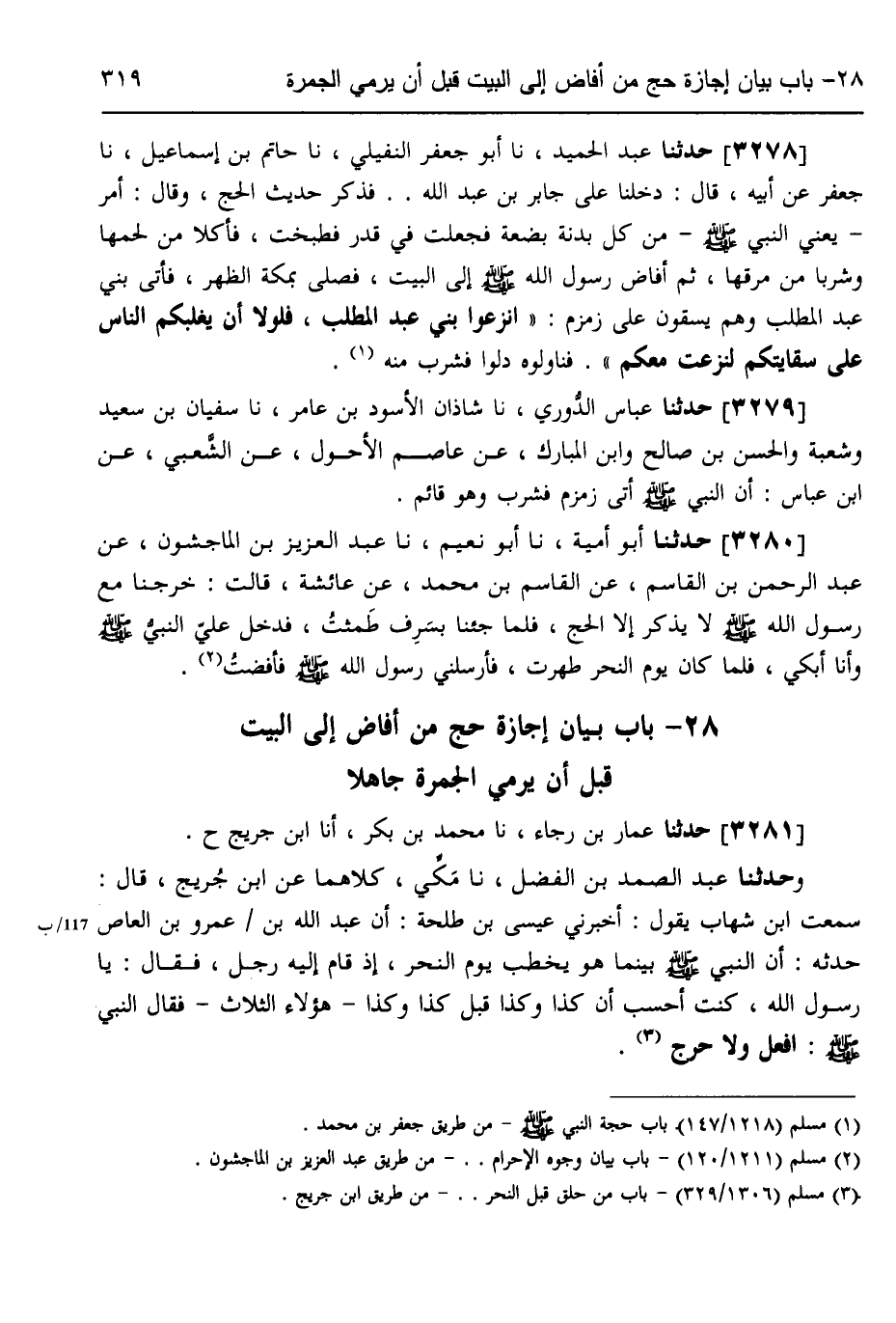 3278 - حَدَّثَنَا عَبْدُ الْحَمِيدِ، نَا أَبُو جَعْفَرٍ النُّفَيْلِيُّ، نَا حَاتِمُ بْنُ إِسْمَاعِيلَ، نَا جَعْفَرٌ، عَنْ أَبِيهِ، قَالَ: دَخَلْنَا عَلَى جَابِرِ بْنِ عَبْدِ اللَّهِ، فَذَكَرَ حَدِيثَ الْحَجِّ، وَقَالَ: أَمَرَ، يَعْنِي النَّبِيَّ صَلَّى اللهُ عَلَيْهِ وَسَلَّمَ مِنْ كُلِّ بَدَنَةٍ بَضْعَةً فَجُعِلَتْ فِي قِدْرٍ فَطُبِخَتْ فَأَكَلَا مِنْ لَحْمِهَا وَشَرِبَا مِنْ مَرَقِهَا، ثُمَّ أَفَاضَ رَسُولُ اللَّهِ صَلَّى اللهُ عَلَيْهِ وَسَلَّمَ إِلَى الْبَيْتِ فَصَلَّى بِمَكَّةَ الظُّهْرَ، فَأَتَى بَنِي عَبْدِ الْمُطَّلِبِ وَهُمْ يَسْقُونَ عَلَى زَمْزَمَ: «§انْزِعُوا بَنِي عَبْدِ الْمُطَّلِبِ فَلَوْلَا أَنْ يَغْلِبَكُمُ النَّاسُ عَلَى سِقَايَتِكُمْ لَنَزَعْتُ مَعَكُمْ» فَنَاوَلُوهُ دَلْوًا فَشَرِبَ مِنْهُ