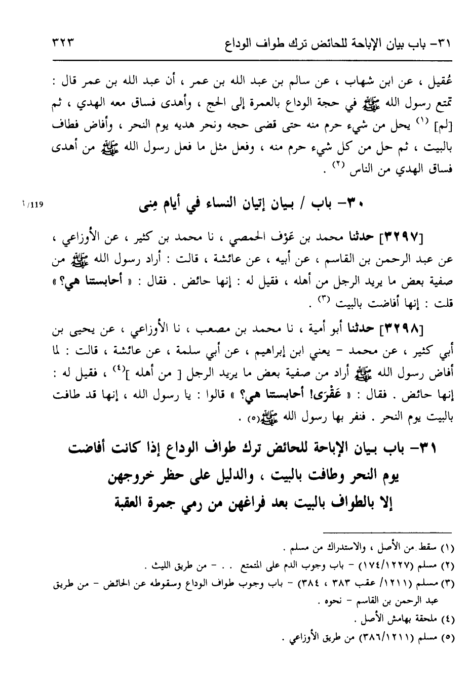 3298 - حَدَّثَنَا أَبُو أُمَيَّةَ، نَا مُحَمَّدُ بْنُ مُصْعَبٍ، نَا الْأَوْزَاعِيُّ، عَنْ يَحْيَى بْنِ أَبِي كَثِيرٍ، عَنْ مُحَمَّدٍ يَعْنِي ابْنَ إِبْرَاهِيمَ، عَنْ أَبِي سَلَمَةَ،، عَنْ عَائِشَةَ قَالَتْ: لَمَّا أَفَاضَ رَسُولُ اللَّهِ صَلَّى اللهُ عَلَيْهِ وَسَلَّمَ §أَرَادَ مِنْ صَفِيَّةَ بَعْضَ مَا يُرِيدُ الرَّجُلُ مِنْ أَهْلِهِ فَقِيلَ لَهُ: إِنَّهَا حَائِضٌ، فَقَالَ: «عَقْرَى، أَحَابِسَتُنَا هِيَ؟» قَالُوا: يَا رَسُولَ اللَّهِ، إِنَّهَا قَدْ طَافَتْ بِالْبَيْتِ يَوْمَ النَّحْرِ، فَنَفَرَ بِهَا رَسُولُ اللَّهِ صَلَّى اللهُ عَلَيْهِ وَسَلَّمَ