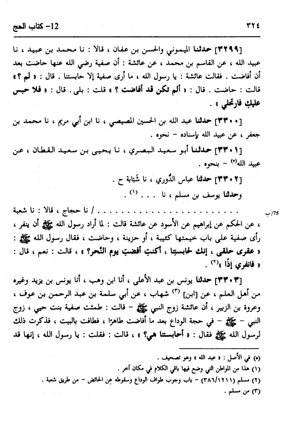 3303 - حَدَّثَنَا يُونُسُ بْنُ عَبْدِ الْأَعْلَى، أَنَا ابْنُ وَهْبٍ، أَنَا يُونُسُ بْنُ يَزِيدَ، وَغَيْرُهُ مِنْ أَهْلِ الْعِلْمِ، عَنِ ابْنِ شِهَابٍ، عَنْ أَبِي سَلَمَةَ بْنِ عَبْدِ الرَّحْمَنِ بْنِ عَوْفٍ، وَعُرْوَةَ بْنِ الزُّبَيْرِ، أَنَّ عَائِشَةَ زَوْجَ النَّبِيَّ صَلَّى اللهُ عَلَيْهِ وَسَلَّمَ قَالَتْ: طَمِثَتْ صَفِيَّةُ بِنْتُ حُيَيٍّ زَوْجُ النَّبِيِّ صَلَّى اللهُ عَلَيْهِ وَسَلَّمَ فِي حَجَّةِ الْوَدَاعِ بَعْدَ مَا أَفَاضَتْ طَاهِرًا، فَطَافَتْ بِالْبَيْتِ، فَذَكَرْتُ ذَلِكَ لِرَسُولِ اللَّهِ صَلَّى اللهُ عَلَيْهِ وَسَلَّمَ فَقَالَ: «§أَحَابِسَتُنَا هِيَ؟» قَالَتْ: فَقُلْتُ: يَا رَسُولَ اللَّهِ، إِنَّهَا قَدْ -[325]- أَفَاضَتْ وَهِيَ طَاهِرٌ، ثُمَّ طَمِثَتْ بَعْدَ الْإِفَاضَةِ، قَالَ رَسُولُ اللَّهِ صَلَّى اللهُ عَلَيْهِ وَسَلَّمَ: «فَلْتَنْفِرْ»