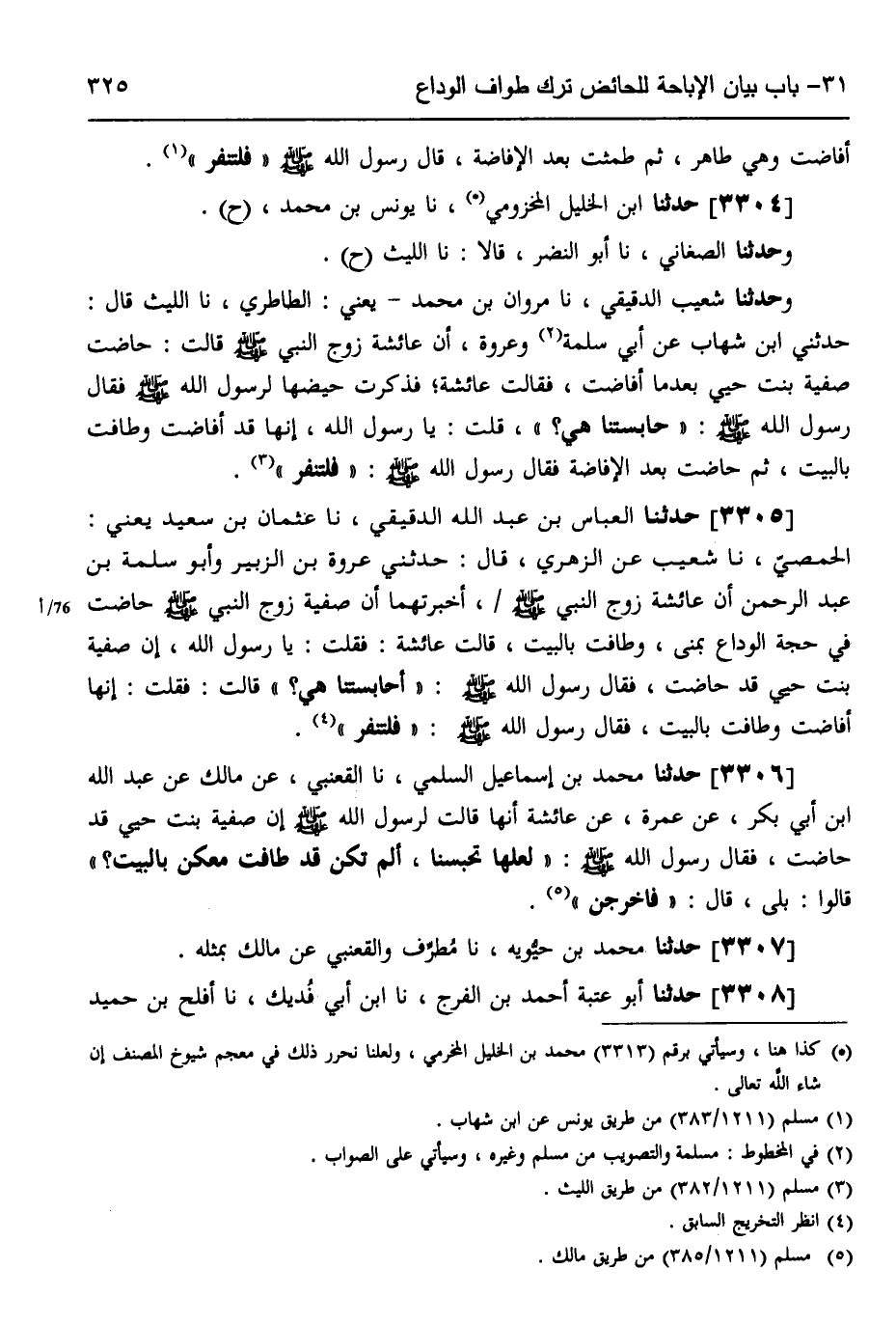 3306 - حَدَّثَنَا مُحَمَّدُ بْنُ إِسْمَاعِيلَ السُّلَمِيُّ، نَا الْقَعْنَبِيُّ، عَنْ مَالِكٍ، عَنْ عَبْدِ اللَّهِ بْنِ أَبِي بَكْرٍ، عَنْ عَمْرَةَ،، عَنْ عَائِشَةَ، أَنَّهَا قَالَتْ لِرَسُولِ اللَّهِ صَلَّى اللهُ عَلَيْهِ وَسَلَّمَ: إِنَّ صَفِيَّةَ بِنْتَ حُيَيٍّ قَدْ حَاضَتْ، فَقَالَ رَسُولُ اللَّهِ صَلَّى اللهُ عَلَيْهِ وَسَلَّمَ: «§لَعَلَّهَا تَحْبِسُنَا، أَلَمْ تَكُنْ قَدْ طَافَتْ مَعَكُنَّ بِالْبَيْتِ؟» قَالُوا: بَلَى، قَالَ: «فَاخْرُجْنَ»