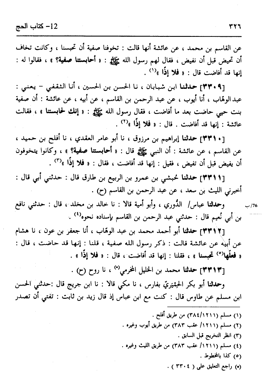 3312 - حَدَّثَنَا أَبُو أَحْمَدَ مُحَمَّدُ بْنُ عَبْدِ الْوَهَّابِ، أَنَا جَعْفَرُ بْنُ عَوْنٍ، نَا هِشَامٌ، عَنْ أَبِيهِ،، عَنْ عَائِشَةَ قَالَتْ: ذَكَرَ رَسُولُ اللَّهِ صَفِيَّةَ قُلْنَا: إِنَّهَا قَدْ حَاضَتْ، قَالَ: «§فَلَعَلَّهَا تَحْبِسُنَا» فَقُلْنَا: إِنَّهَا قَدْ أَفَاضَتْ، قَالَ: «فَلَا إِذًا»