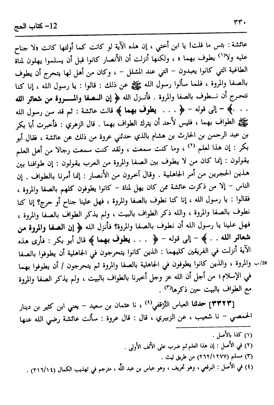 3323 - حَدَّثَنَا الْعَبَّاسُ التَّرْقُفِيُّ، نَا عُثْمَانُ بْنُ سَعِيدٍ يَعْنِي ابْنَ كَثِيرِ بْنِ دِينَارٍ الْحِمْصِيَّ، نَا شُعَيْبٌ، عَنِ الزُّبَيْرِيِّ، قَالَ: قَالَ عُرْوَةُ: سَأَلْتُ عَائِشَةَ رَضِيَ اللَّهُ عَنْهَا -[331]-، قُلْتُ لَهَا: أَرَأَيْتِ قَوْلَ اللَّهِ {إِنَّ الصَّفَا وَالْمَرْوَةَ مِنْ شَعَائِرِ اللَّهِ} [البقرة: 158] إِلَى آخِرِ الْآيَةِ، فَقُلْتُ لِعَائِشَةَ زَوْجِ النَّبِيِّ صَلَّى اللهُ عَلَيْهِ وَسَلَّمَ: مَا عَلَى أَحَدٍ جُنَاحٌ أَنْ لَا يَطَّوَّفَ بِالصَّفَا وَالْمَرْوَةِ؟ قَالَتْ عَائِشَةُ: بِئْسَ مَا قُلْتَ يَا ابْنَ أُخْتِي، إِنَّ هَذِهِ الْآيَةَ لَوْ كَانَتْ عَلَى مَا أَوَّلْتَهَا عَلَيْهِ: فَلَا جُنَاحَ عَلَيْهِ أَنْ لَا يَطَّوَّفَ بِهِمَا، وَلَكِنَّهَا إِنَّمَا أُنْزِلَتْ فِي الْأَنْصَارِ قَبْلَ أَنْ يُسْلِمُوا، كَانُوا يُهِلُّونَ لِلْمَنَاةِ الطَّاغِيَةِ الَّتِي كَانُوا يَعْبُدُونَ عِنْدَ الْمُشَلَّلِ، وَكَانَ مَنْ أَهَلَّ لَهَا يَتَحَرَّجُ أَنْ يَطُوفَ بِالصَّفَا وَالْمَرْوَةِ، فَأَنْزَلَ اللَّهُ الْقُرْآنَ: {إِنَّ الصَّفَا وَالْمَرْوَةَ مِنْ شَعَائِرِ اللَّهِ فَمَنْ حَجَّ الْبَيْتَ أَوِ اعْتَمَرَ فَلَا جُنَاحَ عَلَيْهِ أَنْ يَطَّوَّفَ بِهِمَا} [البقرة: 158] ، قَالَتْ عَائِشَةُ: «قَدْ §سَنَّ رَسُولُ اللَّهِ صَلَّى اللهُ عَلَيْهِ وَسَلَّمَ الطَّوَافَ بِهِمَا فَلَيْسَ لِأَحَدٍ أَنْ يَتْرُكَ الطَّوَافَ بِهِمَا» رَوَاهُ سُفْيَانُ، عَنِ الزُّهْرِيِّ، بِطُولِهِ وَفِيهِ: قَالَتْ عَائِشَةُ: «طَافَ رَسُولُ اللَّهِ صَلَّى اللهُ عَلَيْهِ وَسَلَّمَ وَالْمُسْلِمُونَ وَكَانَتْ سُنَّةً» رَوَاهُ حَرْمَلَةُ، عَنِ ابْنِ وَهْبٍ، عَنْ يُونُسَ، عَنِ الزُّهْرِيِّ، بِطُولِهِ وَقَالَ: إِنَّ الْأَنْصَارَ كَانُوا قَبْلَ أَنْ يُسْلِمُوا هُمْ وَغَسَّانُ يُهِلُّونَ لِمَنَاةَ، فَيَتَحَرَّجُوا أَنْ يَطُوفُوا بَيْنَ الصَّفَا وَالْمَرْوَةِ وَكَانَ ذَلِكَ سُنَّةً فِي أَيَّامِهِمْ