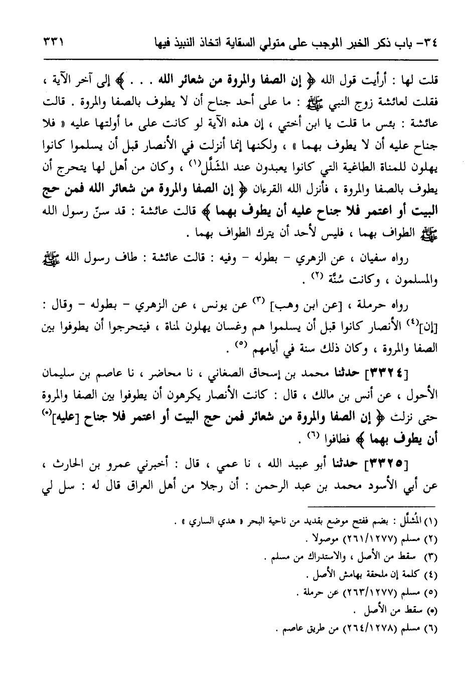 3324 - حَدَّثَنَا مُحَمَّدُ بْنُ إِسْحَاقَ الصَّغَانِيُّ، نَا مُحَاضِرٌ، نَا عَاصِمُ بْنُ سُلَيْمَانَ الْأَحْوَلُ،، عَنْ أَنَسِ بْنِ مَالِكٍ قَالَ: كَانَتِ الْأَنْصَارُ يَكْرَهُونَ أَنْ يَطُوفُوا بَيْنَ الصَّفَا وَالْمَرْوَةِ حَتَّى نَزَلَتْ: " {§إِنَّ الصَّفَا وَالْمَرْوَةَ مِنْ شَعَائِرِ} [البقرة: 158] اللَّهِ فَمَنْ حَجَّ الْبَيْتَ أَوِ اعْتَمَرَ فَلَا جُنَاحَ عَلَيْهِ أَنْ يَطَّوَّفَ بِهِمَا " فَطَافُوا