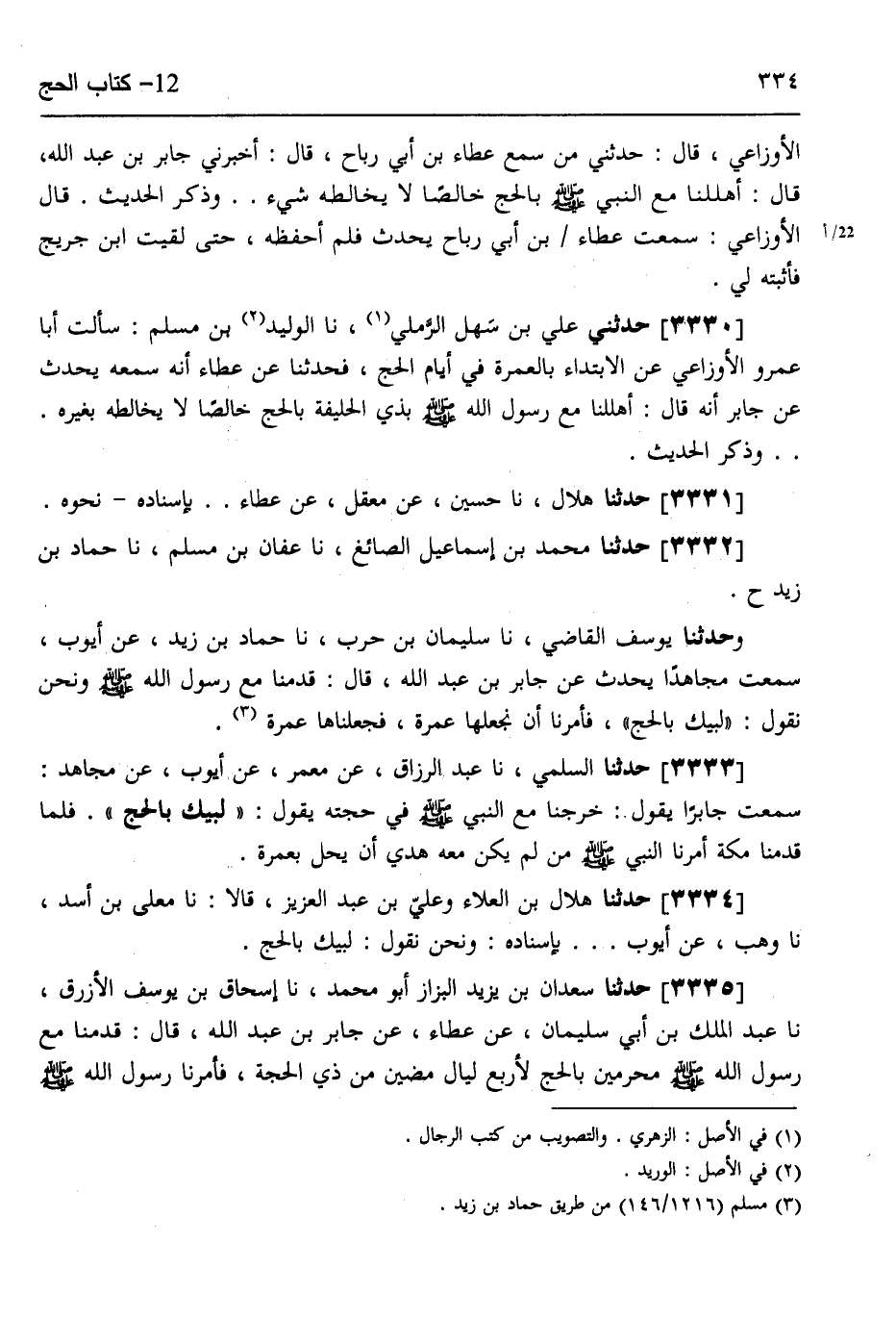 3330 - حَدَّثَنِي عَلِيُّ بْنُ سَهْلٍ الرَّمْلِيُّ، نَا الْوَلِيدُ بْنُ مُسْلِمٍ: سَأَلْتَ أَبَا عَمْرٍو الْأَوْزَاعِيَّ عَنِ الِابْتِدَاءِ بِالْعُمْرَةِ فِي أَيَّامِ الْحَجِّ، فَحَدَّثَنَا عَنْ عَطَاءٍ، أَنَّهُ سَمِعَهُ يُحَدِّثُ عَنْ جَابِرٍ، أَنَّهُ قَالَ: «§أَهْلَلْنَا مَعَ رَسُولِ اللَّهِ صَلَّى اللهُ عَلَيْهِ وَسَلَّمَ بِذِي الْحُلَيْفَةِ بِالْحَجِّ خَالِصًا لَا يُخَالِطُهُ بِغَيْرِهِ» وَذَكَرَ الْحَدِيثَ،