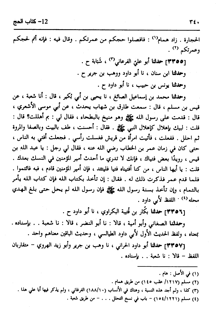3355 - حَدَّثَنَا أَبُو عَلِيُّ الْفِرْعَانِيُّ شَبَابَةُ، ح وَحَدَّثَنَا ابْنُ سِنَانَ، نَا أَبُو دَاوُدَ، وَوَهْبُ بْنُ جَرِيرٍ، ح وَحَدَّثَنَا يُونُسُ بْنُ حَبِيبٍ، نَا أَبُو دَاوُدَ، ح وَحَدَّثَنَا مُحَمَّدُ بْنُ إِسْمَاعِيلَ الصَّائِغُ، نَا يَحْيَى بْنُ أَبِي بُكَيْرٍ، قَالَ: أَنَا شُعْبَةُ، عَنْ قَيْسِ بْنِ مُسْلِمٍ، قَالَ: سَمِعْتُ طَارِقَ بْنَ شِهَابٍ يُحَدِّثُ،، عَنْ أَبِي مُوسَى الْأَشْعَرِيِّ، قَالَ: قَدِمْتُ عَلَى رَسُولِ اللَّهِ صَلَّى اللهُ عَلَيْهِ وَسَلَّمَ وَهُوَ مُنِيخٌ بِالْبَطْحَاءِ فَقَالَ لِي: «§بِمَ أَهْلَلْتَ؟» قَالَ: قُلْتُ: لَبَّيْكَ بِإِهْلَالٍ كَإِهْلَالِ النَّبِيِّ صَلَّى اللهُ عَلَيْهِ وَسَلَّمَ، فَقَالَ: «أَحْسَنْتَ، طُفْ بِالْبَيْتِ وَبِالصَّفَا وَالْمَرْوَةِ، ثُمَّ احْلِلْ» فَفَعَلْتُ، فَأَتَيْتُ امْرَأَةً مِنْ قُرَيْشٍ فَغَسَلْتُ رَأْسِي، فَجَعَلْتُ أُفْتِي بِهِ النَّاسَ حَتَّى كَانَ فِي زَمَانِ عُمَرَ بْنِ الْخَطَّابِ رَضِيَ اللَّهُ عَنْهُ فَقَالَ لِي رَجُلٌ: يَا عَبْدَ اللَّهِ بْنَ قَيْسٍ رُوَيْدًا بَعْضَ فُتْيَاكَ فَإِنَّكَ لَا تَدْرِي مَا أَحْدَثَ أَمِيرُ الْمُؤْمِنِينَ فِي النُّسُكِ بَعْدَكَ، قُلْتُ: يَا أَيُّهَا النَّاسُ، مَنْ كُنَّا أَفْتَيْنَاهُ فُتْيَا فَلْيَتَّئِدْ، فَإِنَّ أَمِيرَ الْمُؤْمِنِينَ قَادِمٌ فَبِهِ فَأَتِمُّوا، فَلَمَّا قَدِمَ عُمَرُ فَذَكَرْتُ ذَلِكَ لَهُ فَقَالَ: إِنْ تَأْخُذْ بِكِتَابِ اللَّهِ، فَإِنَّ كِتَابَ اللَّهِ يَأْمُرُ بِالتَّمَامِ، وَإِنْ تَأْخُذْ بِسُنَّةِ رَسُولِ اللَّهِ صَلَّى اللهُ عَلَيْهِ وَسَلَّمَ، فَإِنَّ رَسُولَ اللَّهِ لَمْ يَحِلَّ حَتَّى بَلَغَ الْهَدْيُ مَحِلَّهُ. اللَّفْظُ لِأَبِي دَاوُدَ،