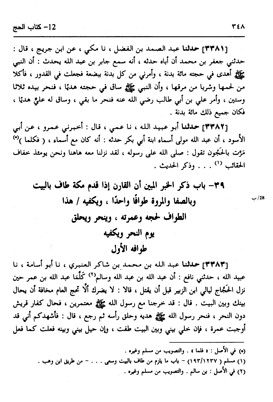3383 - حَدَّثَنَا عَبْدُ اللَّهِ بْنُ مُحَمَّدِ بْنِ شَاكِرٍ الْعَنْبَرِيُّ، نَا أَبُو أُسَامَةَ، نَا عُبَيْدُ اللَّهِ، حَدَّثَنِي نَافِعٌ، أَنَّ عَبْدَ اللَّهِ بْنَ عَبْدِ اللَّهِ وَسَالِمًا كَلَّمَا عَبْدَ اللَّهِ بْنَ عُمَرَ حِينَ نَزَلَ الْحَجَّاجُ الْجُمُعَةَ لَيَالِيَ ابْنِ الزُّبَيْرِ قَبْلَ أَنْ يُقْتَلَ، قَالَا: لَا يَضُرُّكَ أَلَّا تَحُجَّ الْعَامَ مَخَافَةَ أَنْ يُحَالَ بَيْنَكَ وَبَيْنَ الْبَيْتِ، قَالَ: §قَدْ «خَرَجْنَا مَعَ رَسُولِ اللَّهِ صَلَّى اللهُ عَلَيْهِ وَسَلَّمَ مُعْتَمِرِينَ فَحَالَ كُفَّارُ قُرَيْشٍ دُونَ النَّحْرِ، فَنَحَرَ رَسُولُ اللَّهِ صَلَّى اللهُ عَلَيْهِ وَسَلَّمَ هَدْيَهُ وَحَلَقَ رَأْسَهُ» ثُمَّ رَجَعَ قَالَ: فَأُشْهِدُكُمْ أَنِّي قَدْ أَوْجَبْتُ عُمْرَةً، فَإِنْ خُلِّيَ بَيْنِي وَبَيْنَ الْبَيْتِ طُفْتُ، وَإِنْ حِيلَ بَيْنِي وَبَيْنَهُ فَعَلْتُ كَمَا فَعَلَ -[349]- رَسُولُ اللَّهِ صَلَّى اللهُ عَلَيْهِ وَسَلَّمَ مَعَهُ، فَأَهَلَّ بِالْعُمْرَةِ مِنْ ذِي الْحُلَيْفَةِ ثُمَّ سَارَ، فَقَالَ: إِنَّ شَأْنَهُمَا وَاحِدٌ، أُشْهِدُكُمْ أَنِّي قَدْ أَوْجَبْتُ حَجًّا مَعَ عُمْرَتِي قَالَ نَافِعٌ: فَطَافَ لَهُمَا طَوَافًا وَاحِدًا، ثُمَّ لَمْ يَحِلَّ مِنْهُمَا حَتَّى حَلَّ يَوْمَ النَّحْرِ، وَأَهْدَى وَكَانَ يَقُولُ: مَنْ جَمَعَ الْعُمْرَةَ وَالْحَجَّ فَأَهَلَّ بِهِمَا جَمِيعًا فَلَا يَحِلَّ حَتَّى يَحِلَّ مِنْهُمَا جَمِيعًا يَوْمَ النَّحْرِ