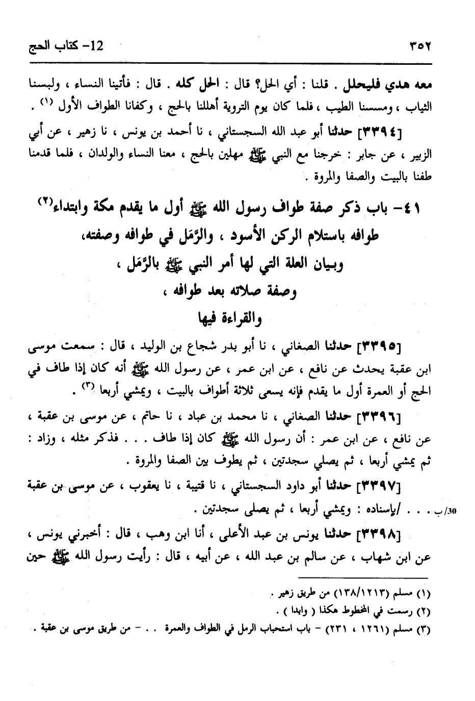 3395 - حَدَّثَنَا الصَّغَانِيُّ، نَا أَبُو بَدْرٍ شُجَاعُ بْنُ الْوَلِيدِ، قَالَ: سَمِعْتُ مُوسَى بْنَ عُقْبَةَ يُحَدِّثُ، عَنْ نَافِعٍ،، عَنِ ابْنِ عُمَرَ، عَنْ رَسُولِ اللَّهِ صَلَّى اللهُ عَلَيْهِ وَسَلَّمَ، أَنَّهُ «كَانَ §إِذَا طَافَ فِي الْحَجِّ أَوِ الْعُمْرَةِ أَوَّلَ مَا يَقْدَمُ فَإِنَّهُ يَسْعَى ثَلَاثَةَ أَطْوَافٍ بِالْبَيْتِ وَيَمْشِي أَرْبَعًا»