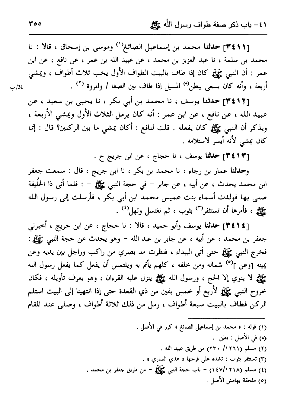 3411 - حَدَّثَنَا مُحَمَّدُ بْنُ إِسْمَاعِيلَ الصَّائِغُ، وَمُوسَى بْنُ إِسْحَاقَ، قَالَا: نَا مُحَمَّدُ بْنُ سَلَمَةَ، نَا عَبْدُ الْعَزِيزِ بْنُ مُحَمَّدٍ، عَنْ عُبَيْدِ اللَّهِ بْنِ عُمَرَ، عَنْ نَافِعٍ،، عَنِ ابْنِ عُمَرَ «أَنَّ النَّبِيَّ صَلَّى اللهُ عَلَيْهِ وَسَلَّمَ كَانَ §إِذَا طَافَ بِالْبَيْتِ الطَّوَافَ الْأَوَّلَ يَخُبُّ ثَلَاثَ أَطْوَافٍ وَيَمْشِي أَرْبَعَةً، وَإِنَّهُ كَانَ يَسْعَى بِبَطْنِ الْمَسِيلِ إِذَا طَافَ بَيْنَ الصَّفَا وَالْمَرْوَةِ»