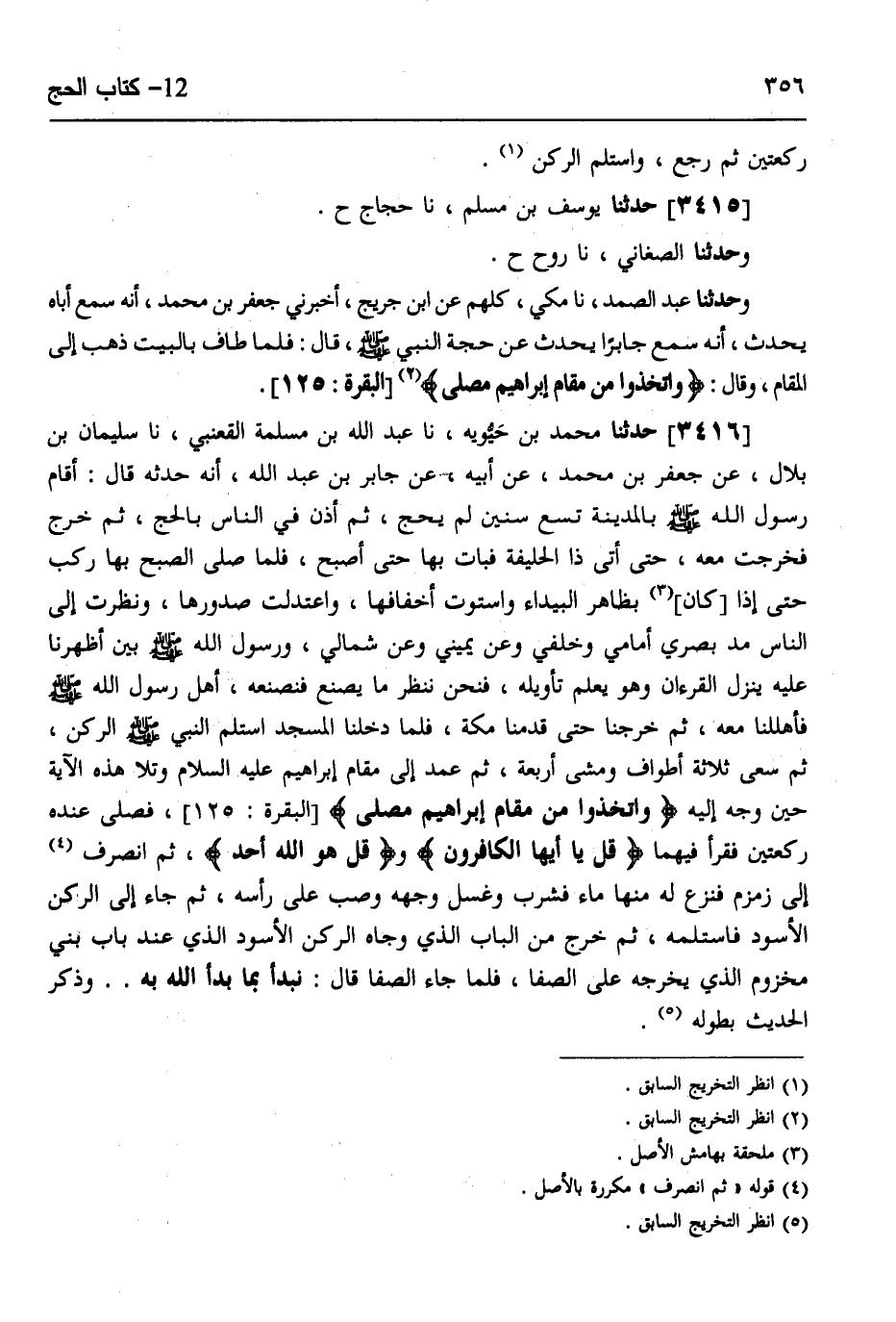 3415 - حَدَّثَنَا يُوسُفُ بْنُ مُسْلِمٍ، نَا حَجَّاجٌ، ح وَحَدَّثَنَا الصَّغَانِيُّ، نَا رَوْحٌ، ح وَحَدَّثَنَا عَبْدُ الصَّمَدِ، نَا مَكِّيٌّ كُلُّهُمْ، عَنِ ابْنِ جُرَيْجٍ، أَخْبَرَنِي جَعْفَرُ بْنُ مُحَمَّدٍ، أَنَّهُ سَمِعَ أَبَاهُ يُحَدِّثُ، أَنَّهُ، سَمِعَ جَابِرًا يُحَدِّثُ عَنْ حَجَّةِ النَّبِيِّ صَلَّى اللهُ عَلَيْهِ وَسَلَّمَ قَالَ: " §فَلَمَّا طَافَ بِالْبَيْتِ ذَهَبَ إِلَى الْمَقَامِ، وَقَالَ: {وَاتَّخِذُوا مِنْ مَقَامِ إِبْرَاهِيمَ مُصَلًّى} [البقرة: 125] "