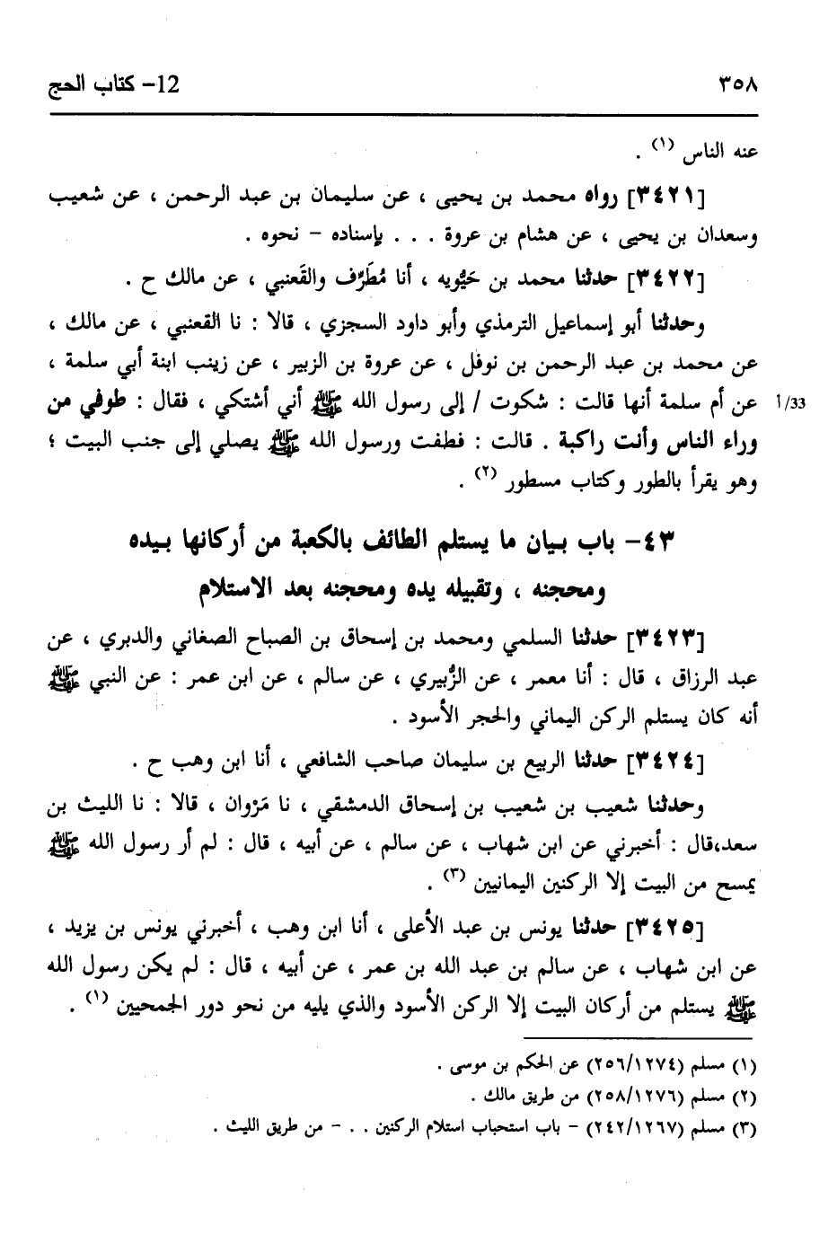 3422 - حَدَّثَنَا مُحَمَّدُ بْنُ حَيَّوَيْهِ، أَنَا مُطَرِّفٌ، وَالْقَعْنَبِيُّ، عَنْ مَالِكٍ، ح وَحَدَّثَنَا أَبُو إِسْمَاعِيلَ التِّرْمِذِيُّ، وَأَبُو دَاوُدَ السِّجْزِيُّ، قَالَا: نَا الْقَعْنَبِيُّ، عَنْ مَالِكٍ، عَنْ مُحَمَّدِ بْنِ عَبْدِ الرَّحْمَنِ بْنِ نَوْفَلٍ، عَنْ عُرْوَةَ بْنِ الزُّبَيْرِ، عَنْ زَيْنَبَ ابْنَةِ أَبِي سَلَمَةَ،، عَنْ أُمِّ سَلَمَةَ أَنَّهَا قَالَتْ: شَكَوْتُ إِلَى رَسُولِ اللَّهِ صَلَّى اللهُ عَلَيْهِ وَسَلَّمَ أَنِّي أَشْتَكِي، فَقَالَ: «§طُوفِي مِنْ وَرَاءِ النَّاسِ وَأَنْتِ رَاكِبَةٌ» قَالَتْ: فَطُفْتُ وَرَسُولُ اللَّهِ صَلَّى اللهُ عَلَيْهِ وَسَلَّمَ يُصَلِّي إِلَى جَنْبِ الْبَيْتِ وَهُوَ يَقْرَأُ: «بِالطُّورِ وَكِتَابٍ مَسْطُورٍ»
