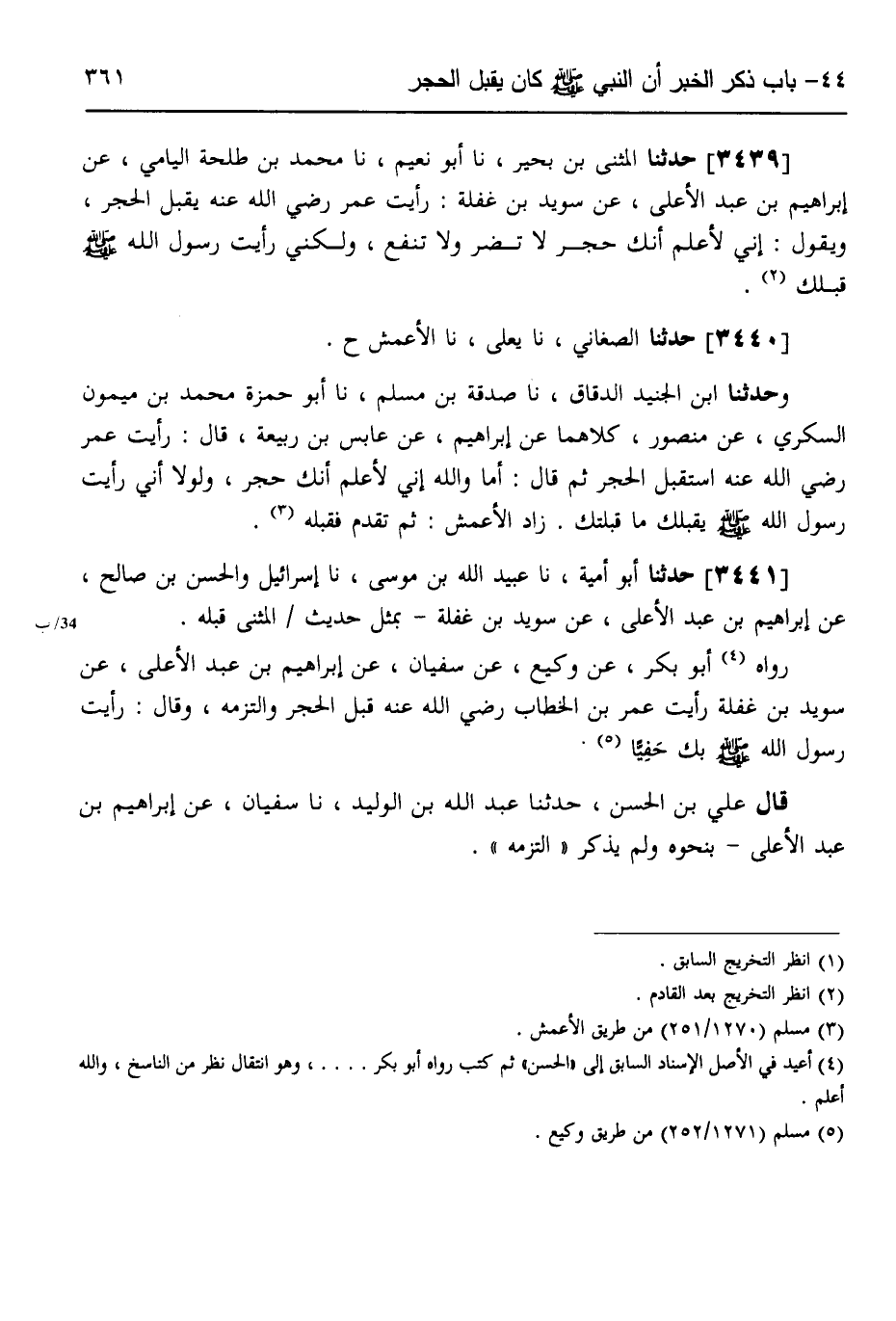 3439 - حَدَّثَنَا الْمُثَنَّى بْنُ بَحِيرٍ، نَا أَبُو نُعَيْمٍ، نَا مُحَمَّدُ بْنُ طَلْحَةَ الْيَامِيُّ، عَنْ إِبْرَاهِيمَ بْنَ عَبْدِ الْأَعْلَى، عَنْ سُوَيْدِ بْنِ غَفَلَةَ: رَأَيْتُ عُمَرَ رَضِيَ اللَّهُ عَنْهُ يُقَبِّلُ الْحَجَرَ وَيَقُولُ: «§إِنِّي لَأَعْلَمُ أَنَّكَ حَجَرٌ لَا تَضُرُّ وَلَا تَنْفَعُ، وَلَكِنِّي رَأَيْتُ رَسُولَ اللَّهِ صَلَّى اللهُ عَلَيْهِ وَسَلَّمَ قَبَّلَكَ»