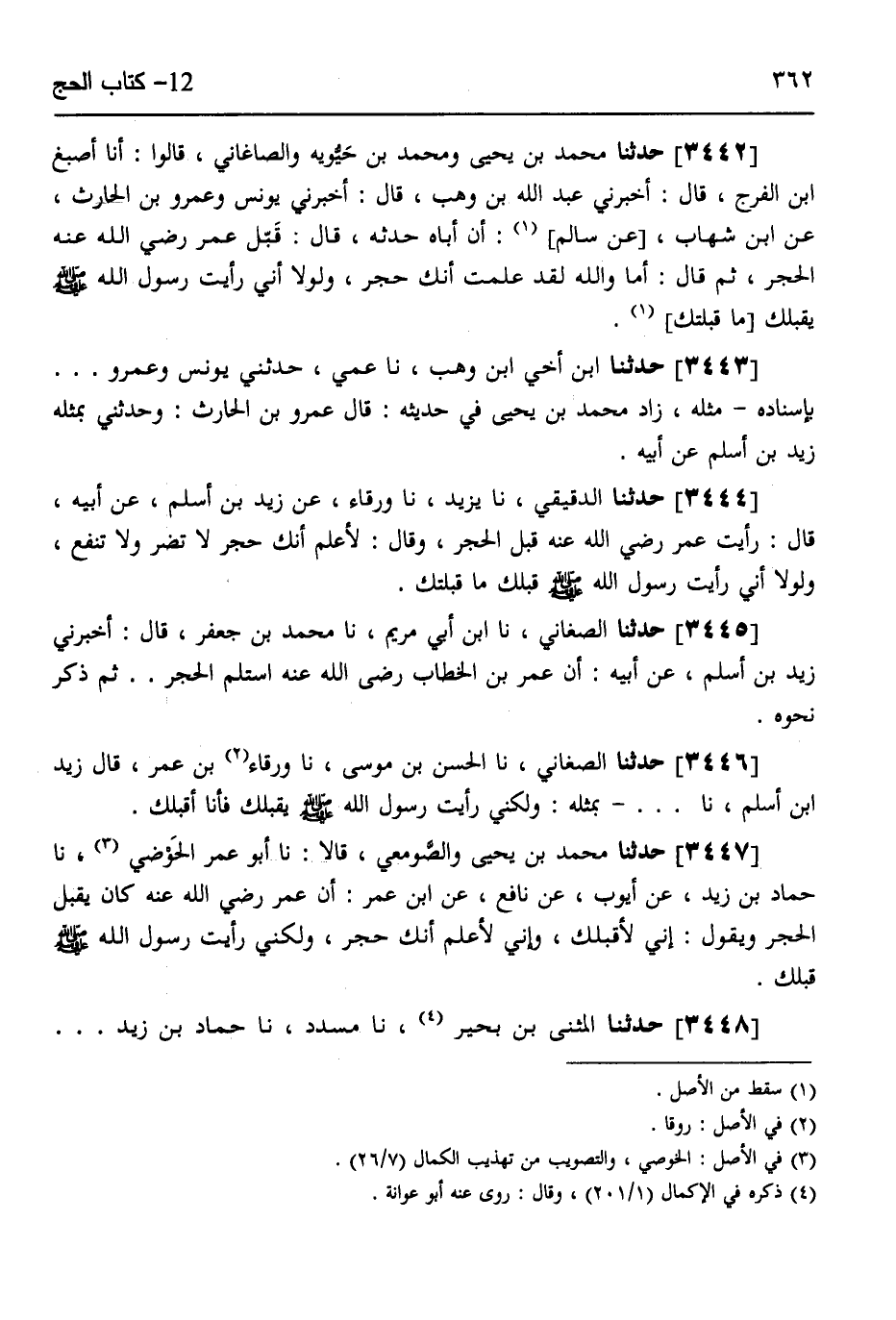 3447 - حَدَّثَنَا مُحَمَّدُ بْنُ يَحْيَى، وَالصَّوْمَعِيُّ، قَالَا: نَا أَبُو عُمَرَ الْحَوْضِيُّ، نَا حَمَّادُ بْنُ زَيْدٍ، عَنْ أَيُّوبَ، عَنْ نَافِعٍ، عَنِ ابْنِ عُمَرَ، أَنَّ عُمَرَ رَضِيَ اللَّهُ عَنْهُ كَانَ يُقَبِّلُ الْحَجَرَ وَيَقُولُ: «§إِنِّي لَأُقَبِّلُكَ، وَإِنِّي لَأَعْلَمُ أَنَّكَ حَجَرٌ، وَلَكِنِّي رَأَيْتُ رَسُولَ اللَّهِ صَلَّى اللهُ عَلَيْهِ وَسَلَّمَ قَبَّلَكَ»