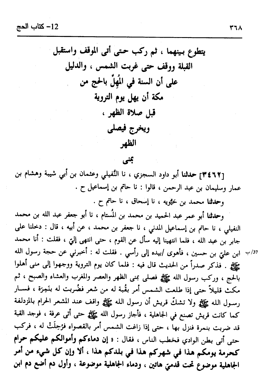 3462 - حَدَّثَنَا أَبُو دَاوُدَ السِّجْزِيُّ، نَا النُّفَيْلِيُّ، وَعُثْمَانُ بْنُ أَبِي شَيْبَةَ، وَهِشَامُ بْنُ عَمَّارٍ، وَسُلَيْمَانُ بْنُ عَبْدِ الرَّحْمَنِ، قَالُوا: نَا حَاتِمُ بْنُ إِسْمَاعِيلَ، ح وَحَدَّثَنَا مُحَمَّدُ بْنُ حَيَّوَيْهِ، نَا إِسْحَاقُ، نَا حَاتِمٌ، ح وَحَدَّثَنَا أَبُو عُمَرَ عَبْدُ الْحَمِيدِ بْنُ الْمُسْتَامِ، نَا أَبُو جَعْفَرٍ عَبْدُ اللَّهِ بْنُ مُحَمَّدٍ النُّفَيْلِيُّ، نَا حَاتِمُ بْنُ إِسْمَاعِيلَ الْمَدَنِيُّ، نَا جَعْفَرُ بْنُ مُحَمَّدٍ، عَنْ أَبِيهِ قَالَ: دَخَلْنَا عَلَى جَابِرِ بْنِ عَبْدِ اللَّهِ، فَلَمَّا انْتَهَيْنَا إِلَيْهِ سَأَلَ عَنِ الْقَوْمِ حَتَّى انْتَهَى إِلَيَّ، فَقُلْتُ: أَنَا مُحَمَّدُ بْنُ عَلِيِّ بْنِ حُسَيْنٍ، فَأَهْوَى بِيَدِهِ إِلَى رَأْسِيِ، فَقُلْتُ لَهُ: أَخْبَرَنِي عَنْ حَجَّةِ رَسُولِ اللَّهِ صَلَّى اللهُ عَلَيْهِ وَسَلَّمَ فَذَكَرَ صَدْرًا مِنَ الْحَدِيثِ قَالَ فِيهِ: فَلَمَّا كَانَ يَوْمُ التَّرْوِيَةِ وَوَجَّهُوا إِلَى مِنًى أَهَلُّوا بِالْحَجِّ، وَرَكِبَ رَسُولُ اللَّهِ صَلَّى اللهُ عَلَيْهِ وَسَلَّمَ فَصَلَّى بِمِنًى الظُّهْرَ وَالْعَصْرَ، وَالْمَغْرِبَ وَالْعِشَاءَ وَالصُّبْحَ، ثُمَّ مَكَثَ قَلِيلًا حَتَّى إِذَا طَلَعَتِ الشَّمْسُ أَمَرَ بِقُبَّةٍ لَهُ مِنْ شَعْرٍ، فَضُرِبَتْ لَهُ بِنَمِرَةَ، فَسَارَ رَسُولُ اللَّهِ صَلَّى اللهُ عَلَيْهِ وَسَلَّمَ، وَلَا تَشُكُّ قُرَيْشٌ أَنَّ رَسُولَ اللَّهِ صَلَّى اللهُ عَلَيْهِ وَسَلَّمَ وَاقِفٌ عِنْدَ الْمَشْعَرِ الْحَرَامِ بِالْمُزْدَلِفَةِ كَمَا كَانَتْ قُرَيْشٌ تَصْنَعُ فِي الْجَاهِلِيَّةِ، فَأَجَازَ رَسُولُ اللَّهِ صَلَّى اللهُ عَلَيْهِ وَسَلَّمَ حَتَّى أَتَى عَرَفَةَ فَوَجَدَ الْقُبَّةَ قَدْ ضُرِبَتْ بِنَمِرَةَ فَنَزَلَ بِهَا، حَتَّى إِذَا زَاغَتِ الشَّمْسُ أَمَرَ بِالْقَصْوَاءِ فَرُحِّلَتْ لَهُ فَرَكِبَ، حَتَّى أَتَى بَطْنَ الْوَادِيِ فَخَطَبَ النَّاسَ فَقَالَ: «§إِنَّ دِمَاءَكُمْ وَأَمْوَالَكُمْ عَلَيْكُمْ حَرَامٌ كَحُرْمَةِ يَوْمِكُمْ هَذَا، فِي شَهْرِكُمْ هَذَا، فِي بَلَدِكُمْ هَذَا، أَلَا وَإِنَّ كُلَّ شَيْءٍ مِنْ أَمْرِ الْجَاهِلِيَّةِ مَوْضُوعٌ تَحْتَ قَدَمَيَّ هَاتَيْنِ، وَدِمَاءُ الْجَاهِلِيَّةِ مَوْضُوعٌ، وَأَوَّلُ دَمٍ أَضَعُ دَمُ ابْنِ -[369]- رَبِيعَةَ بْنِ الْحَارِثِ كَانَ مُسْتَرْضِعًا فِي بَنِي سَعْدٍ فَقَتَلَتْهُ هُذَيْلٌ، وَرِبَا الْجَاهِلِيَّةِ مَوْضُوعٌ، وَأَوَّلُ رِبًا أَضَعُ رِبَا عَبَّاسِ بْنِ عَبْدِ الْمُطَّلِبِ فَإِنَّهُ مَوْضُوعٌ كُلُّهُ، اتَّقُوا اللَّهَ فِي النِّسَاءِ، فَإِنَّكُمْ أَخَذْتُمُوهُنَّ بِأَمَانَةِ اللَّهِ، وَاسْتَحْلَلْتُمْ فُرُوجَهُنَّ بِكَلِمَةِ اللَّهِ تَبَارَكَ وَتَعَالَى، فَإِنَّ لَكُمْ عَلَيْهِنَّ أَلَّا يُوطِئْنَ فُرُشَكُمْ أَحَدًا تَكْرَهُونَهُ، فَإِنْ فَعَلْنَ فَاضْرِبُوهُنَّ غَيْرَ مُبَرِّحٍ، وَلَهُنَّ عَلَيْكُمْ نَفَقَتُهُنَّ وَكِسْوَتُهُنَّ بِالْمَعْرُوفِ، وَإِنِّي قَدْ تَرَكْتُ فِيكُمْ مَا لَمْ تَضِلُّوا بَعْدَهُ إِنِ اعْتَصَمْتُمْ بِهِ كِتَابَ اللَّهِ، وَأَنْتُمْ مَسْئُولُونَ عَنْي فَمَا أَنْتُمْ قَائِلُونَ؟» قَالُوا: نَشْهَدُ أَنَّكَ بَلَّغْتَ وَأَدَّيْتَ وَنَصَحْتَ، فَقَالَ بِإِصْبَعِهِ السَّبَّابَةِ يَرْفَعُهَا إِلَى السَّمَاءِ وَيَنْكُبُهَا إِلَى النَّاسِ: «اللَّهُمَّ اشْهَدْ، اللَّهُمَّ اشْهَدْ، اللَّهُمَّ اشْهَدْ» ثُمَّ أَذَّنَ فَأَقَامَ فَصَلَّى الظُّهْرَ، ثُمَّ أَقَامَ فَصَلَّى الْعَصْرَ لَمْ يُصَلِّ بَيْنَهُمَا شَيْئًا، ثُمَّ رَكِبَ الْقَصْوَاءَ حَتَّى أَتَى الْمَوْقِفَ فَجَعَلَ بَطْنَ الْقَصْوَاءِ إِلَى الصَّخَرَاتِ، وَجَعَلَ جَبَلَ الْمُشَاةِ بَيْنَ يَدَيْهِ و