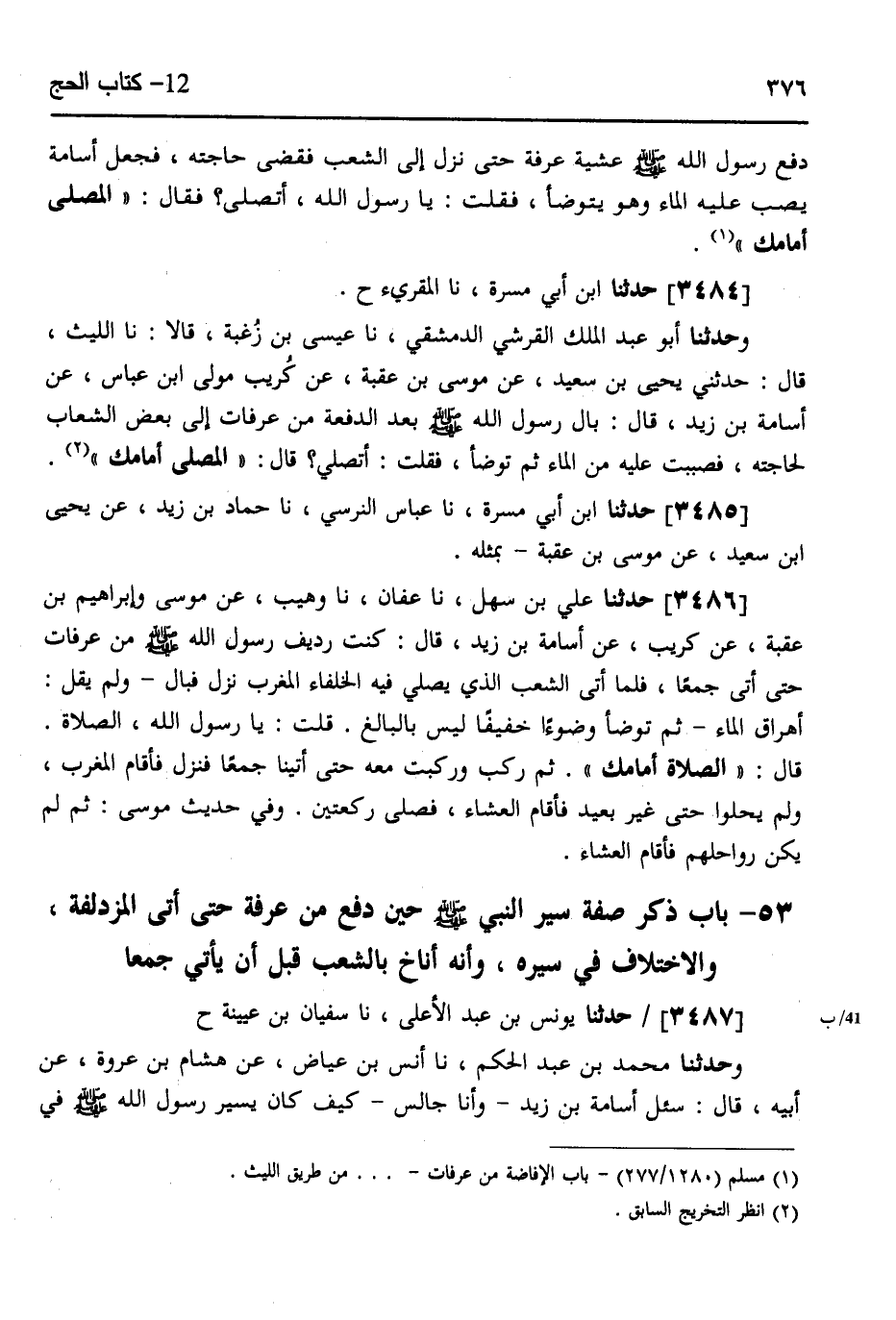 3484 - حَدَّثَنَا ابْنُ أَبِي مَسَرَّةَ، نَا الْمُقْرِئُ، ح وَحَدَّثَنَا أَبُو عَبْدِ الْمَلِكِ الْقُرَشِيُّ الدِّمَشْقِيُّ، نَا عِيسَى بْنُ زُغْبَةَ، قَالَا: نَا اللَّيْثُ، قَالَ: حَدَّثَنِي يَحْيَى بْنُ سَعِيدٍ، عَنْ مُوسَى بْنِ عُقْبَةَ، عَنْ كُرَيْبٍ مَوْلَى ابْنِ عَبَّاسٍ،، عَنْ أُسَامَةَ بْنِ زَيْدٍ قَالَ: بَالَ رَسُولُ اللَّهِ صَلَّى اللهُ عَلَيْهِ وَسَلَّمَ بَعْدَ الدَّفْعَةِ مِنْ عَرَفَاتٍ إِلَى بَعْضِ الشِّعَابِ لِحَاجَتِهِ، فَصَبَبْتُ عَلَيْهِ مِنَ الْمَاءِ ثُمَّ تَوَضَّأَ، فَقُلْتُ: أَتُصَلِّي؟ فَقَالَ: «§الْمُصَلَّى أَمَامَكَ»