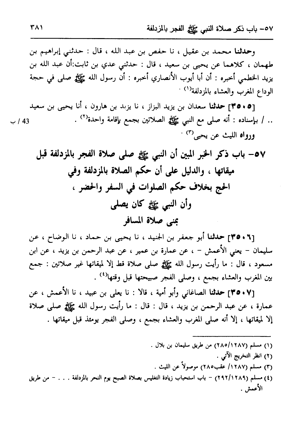 3506 - حَدَّثَنَا أَبُو جَعْفَرِ بْنُ الْجُنَيْدُ، نَا يَحْيَى بْنُ حَمَّادٍ، نَا الْوَضَّاحُ، عَنْ سُلَيْمَانَ يَعْنِي الْأَعْمَشَ، عَنْ عُمَارَةَ بْنِ عُمَيْرٍ، عَنْ عَبْدِ الرَّحْمَنِ بْنِ يَزِيدَ،، عَنِ ابْنِ مَسْعُودٍ قَالَ: «§مَا رَأَيْتُ رَسُولَ اللَّهِ صَلَّى اللهُ عَلَيْهِ وَسَلَّمَ صَلَّى صَلَاةً قَطُّ إِلَّا لِمِيقَاتِهَا غَيْرَ صَلَاتَيْنِ جَمَعَ بَيْنَ الْمَغْرِبِ وَالْعِشَاءِ بِجَمْعٍ، وَصَلَّى الْفَجْرَ صَبِيحَتَهَا قَبْلَ وَقْتِهَا»