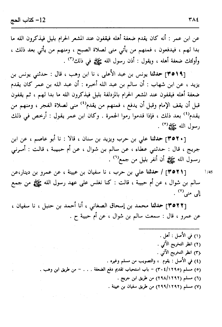 3522 - حَدَّثَنَا مُحَمَّدُ بْنُ إِسْحَاقَ الصَّغَانِيُّ، أَنَا أَحْمَدُ بْنُ حَنْبَلٍ، نَا سُفْيَانُ، عَنْ عَمْرٍو قَالَ: سَمِعْتُ سَالِمَ بْنَ شَوَّالٍ، عَنْ أُمِّ حَبِيبَةَ، ح -[385]- وَحَدَّثَنَا ابْنُ أَبِي مَسَرَّةَ، نَا الْحُمَيْدِيُّ، وَسَعِيدُ بْنُ مَنْصُورٍ، قَالَا: نا سُفْيَانُ، نَا عَمْرُو بْنُ دِينَارٍ، قَالَ: حَدَّثَنِي سَالِمُ بْنُ شَوَّالٍ،، عَنْ أُمِّ حَبِيبَةَ أَنَّهَا قَالَتْ: «إِنْ §كُنَّا نَفْعَلُهُ عَلَى عَهْدِ رَسُولِ اللَّهِ صَلَّى اللهُ عَلَيْهِ وَسَلَّمَ بِغَلَسٍ مِنَ الْمُزْدَلِفَةِ إِلَى مِنًى» قَالَ الْحُمَيْدِيُّ: وَكَانَ سَالِمُ بْنُ شَوَّالٍ رَجُلٌ مِنْ أَهْلِ مَكَّةَ لَمْ أَسْمَعْ أَحَدًا يُحَدِّثُ عَنْهُ إِلَّا عُمَرَ، وَهَذَا الْحَدِيثُ هَذَا لَفْظُ الْحُمَيْدِيِّ، وَأَمَّا لَفْظُ أَحْمَدَ بْنِ حَنْبَلٍ: «كُنَّا نَفْعَلُهُ عَلَى عَهْدِ رَسُولِ اللَّهِ صَلَّى اللهُ عَلَيْهِ وَسَلَّمَ مِنْ جَمْعٍ إِلَى مِنًى» وَقَالَ سُفْيَانُ مَرَّةً: «كُنَّا نُغَلِّسُ عَلَى عَهْدِ رَسُولِ اللَّهِ صَلَّى اللهُ عَلَيْهِ وَسَلَّمَ مِنَ الْمُزْدَلِفَةِ إِلَى مِنًى» وَلَفْظُ عَلِيِّ بْنِ حَرْبٍ: «كُنَّا نُغَلِّسُ عَلَى عَهْدِ رَسُولِ اللَّهِ صَلَّى اللهُ عَلَيْهِ وَسَلَّمَ مِنْ جَمْعٍ إِلَى مِنًى»