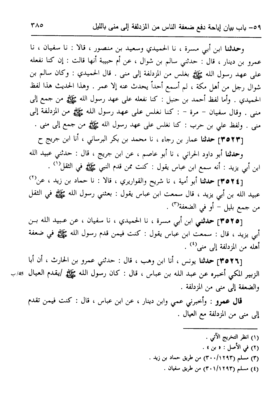 3525 - حَدَّثَنِي ابْنُ أَبِي مَسَرَّةَ، نَا الْحُمَيْدِيُّ، نَا سُفْيَانُ، عَنْ عُبَيْدِ اللَّهِ بْنِ أَبِي يَزِيدَ قَالَ:، سَمِعْتُ ابْنَ عَبَّاسٍ يَقُولُ: «§كُنْتُ فِيمَنْ قَدَّمَ رَسُولُ اللَّهِ صَلَّى اللهُ عَلَيْهِ وَسَلَّمَ فِي ضَعَفَةِ أَهْلِهِ مِنَ الْمُزْدَلِفَةِ إِلَى مِنًى»
