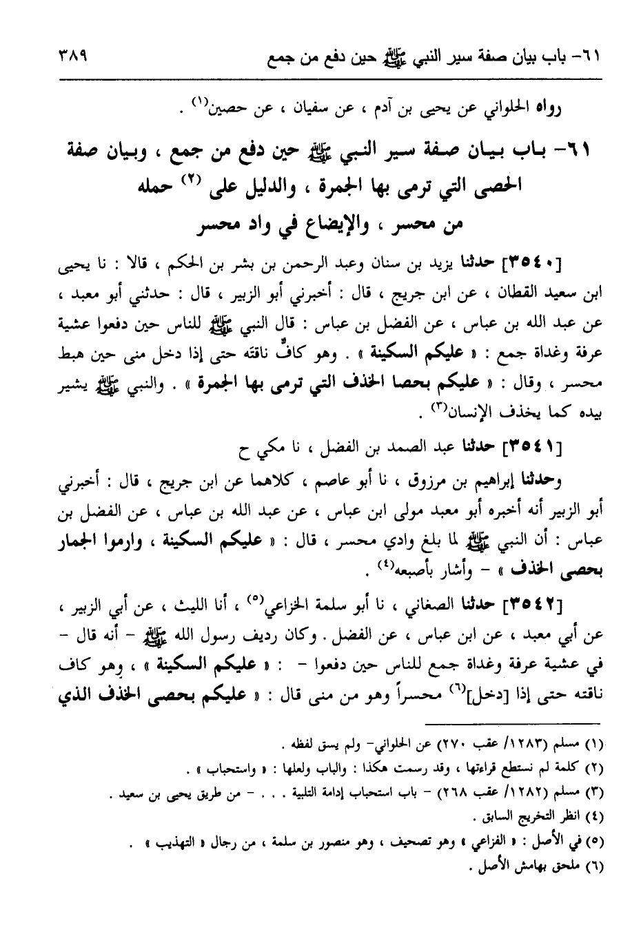 3541 - حَدَّثَنَا عَبْدُ الصَّمَدِ بْنُ الْفَضْلِ، نَا مَكِّيٌّ، ح وَحَدَّثَنَا إِبْرَاهِيمُ بْنُ مَرْزُوقٍ، نَا أَبُو عَاصِمٍ كِلَاهُمَا، عَنِ ابْنِ جُرَيْجٍ قَالَ: أَخْبَرَنِي أَبُو الزُّبَيْرِ أَنَّهُ أَخْبَرَهُ أَبُو مَعْبَدٍ مَوْلَى ابْنِ عَبَّاسٍ، عَنْ عَبْدِ اللَّهِ بْنِ عَبَّاسٍ،، عَنِ الْفَضْلِ بْنِ عَبَّاسٍ، أَنَّ النَّبِيَّ صَلَّى اللهُ عَلَيْهِ وَسَلَّمَ لَمَّا بَلَغَ وَادِي مُحَسِّرٍ قَالَ: «§عَلَيْكُمُ السَّكِينَةُ، وَارْمُوا الْجِمَارَ بِحَصَى الْخَذْفِ» وَأَشَارَ بِأُصْبُعِهِ
