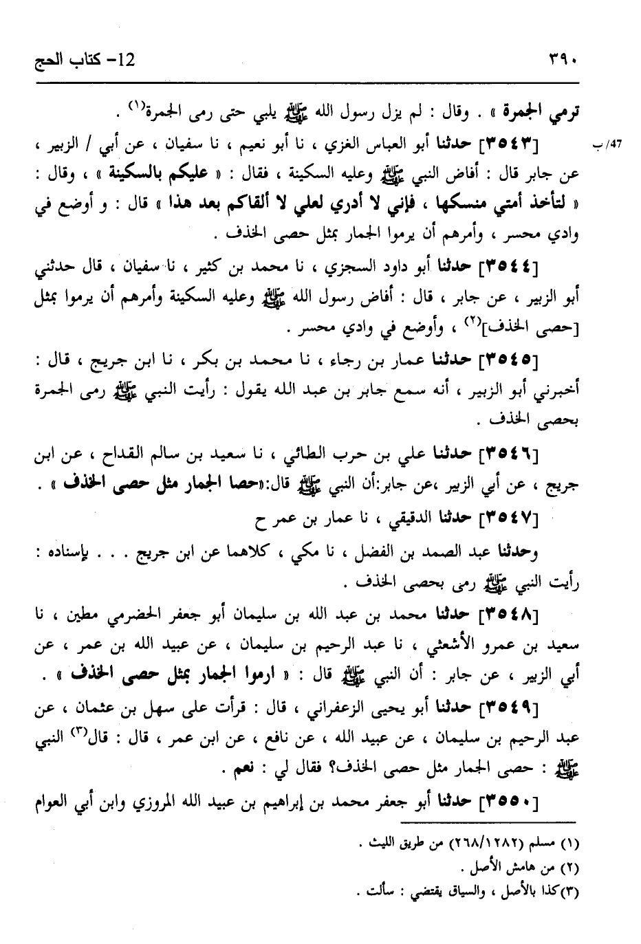 3543 - حَدَّثَنَا أَبُو الْعَبَّاسِ الْغَزِّيُّ، نَا أَبُو نُعَيْمٍ، نَا سُفْيَانُ، عَنْ أَبِي الزُّبَيْرِ،، عَنْ جَابِرٍ قَالَ: أَفَاضَ النَّبِيُّ صَلَّى اللهُ عَلَيْهِ وَسَلَّمَ وَعَلَيْهِ السَّكِينَةُ فَقَالَ: «عَلَيْكُمْ بِالسَّكِينَةِ» وَقَالَ: «§لِتَأْخُذْ أُمَّتِي مَنْسَكَهَا، فَإِنِّي لَا أَدْرِي لَعَلِّي لَا أَلْقَاكُمْ بَعْدَ هَذَا» قَالَ: وَأَوْضَعَ فِي وَادِي مُحَسِّرٍ، وَأَمَرَهُمْ أَنْ يَرْمُوا الْجِمَارَ بِمِثْلِ حَصَى الْخَذْفِ