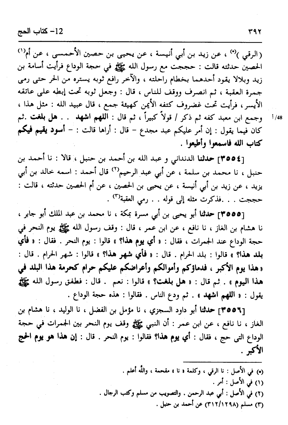3555 - حَدَّثَنَا أَبُو يَحْيَى بْنُ أَبِي مَسَرَّةَ بِمَكَّةَ، نَا مُحَمَّدُ بْنُ عَبْدِ الْمَلِكِ أَبُو جَابِرٍ، نَا هِشَامُ بْنُ الْغَازِ، نَا نَافِعٌ،، عَنِ ابْنِ عُمَرَ قَالَ: وَقَفَ رَسُولُ اللَّهِ صَلَّى اللهُ عَلَيْهِ وَسَلَّمَ يَوْمَ النَّحْرِ فِي حَجَّةِ الْوَدَاعِ عِنْدَ الْجَمَرَاتِ فَقَالَ: «أَيُّ يَوْمٍ هَذَا؟» قَالُوا: يَوْمُ النَّحْرِ، فَقَالَ: «فَأَيُّ بَلَدٍ هَذَا؟» قَالُوا: الْبَلَدُ الْحَرَامُ، قَالَ: «فَأَيُّ شَهْرٍ هَذَا؟» قَالُوا: شَهْرُ الْحَرَامِ، قَالَ: «§هَذَا يَوْمُ الْحَجِّ الْأَكْبَرِ، فَدِمَاؤُكُمْ وَأَمْوَالُكُمْ وَأَعْرَاضُكُمْ عَلَيْكُمْ حَرَامٌ كَحُرْمَةِ هَذَا الْبَلَدِ فِي هَذَا الْيَوْمِ» ثُمَّ قَالَ: «هَلْ بَلَّغْتُ؟» قَالُوا: نَعَمْ، قَالَ: فَطَفِقَ رَسُولُ اللَّهِ صَلَّى اللهُ عَلَيْهِ وَسَلَّمَ يَقُولُ: «اللَّهُمَّ اشْهَدْ» ثُمَّ وَدَّعَ النَّاسَ، فَقَالُوا: هَذِهِ حَجَّةُ الْوَدَاعِ
