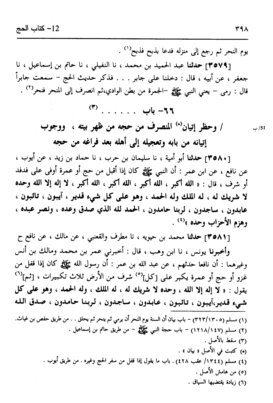 3581 - حَدَّثَنَا مُحَمَّدُ بْنُ حَيَّوَيْهِ، نَا مُطَرِّفٌ، وَالْقَعْنَبِيُّ، عَنْ مَالِكٍ، عَنْ نَافِعٍ، ح وَأَخْبَرَنَا يُونُسُ، نَا ابْنُ وَهْبٍ، قَالَ: أَخْبَرَنِي عُمَرُ بْنُ مُحَمَّدٍ، وَمَالِكُ بْنُ أَنَسٍ، وَغَيْرُهُمَا أَنَّ نَافِعًا حَدَّثَهُمْ،، عَنْ عَبْدِ اللَّهِ بْنِ عُمَرَ، أَنَّ رَسُولَ اللَّهِ صَلَّى اللهُ عَلَيْهِ وَسَلَّمَ كَانَ إِذَا قَفَلَ مِنْ غَزْوٍ، أَوْ حَجٍّ، أَوْ عُمْرَةٍ، يُكَبِّرُ عَلَى كُلِّ شَرَفٍ مِنَ الْأَرْضِ ثَلَاثَ تَكْبِيرَاتٍ، ثُمَّ يَقُولُ: «§لَا إِلَهَ إِلَّا اللَّهُ، وَحْدَهُ لَا شَرِيكَ لَهُ، لَهُ الْمُلْكُ، وَلَهُ الْحَمْدُ، وَهُوَ عَلَى كُلِّ شَيْءٍ قَدِيرٌ، آيِبُونَ، تَائِبُونَ، عَابِدُونَ، سَاجِدُونَ، لِرَبِّنَا حَامِدُونَ، صَدَقَ اللَّهُ -[399]- وَعْدَهُ، وَنَصَرَ عَبْدُهُ، وَهَزَمَ الْأَحْزَابَ وَحْدَهُ»
