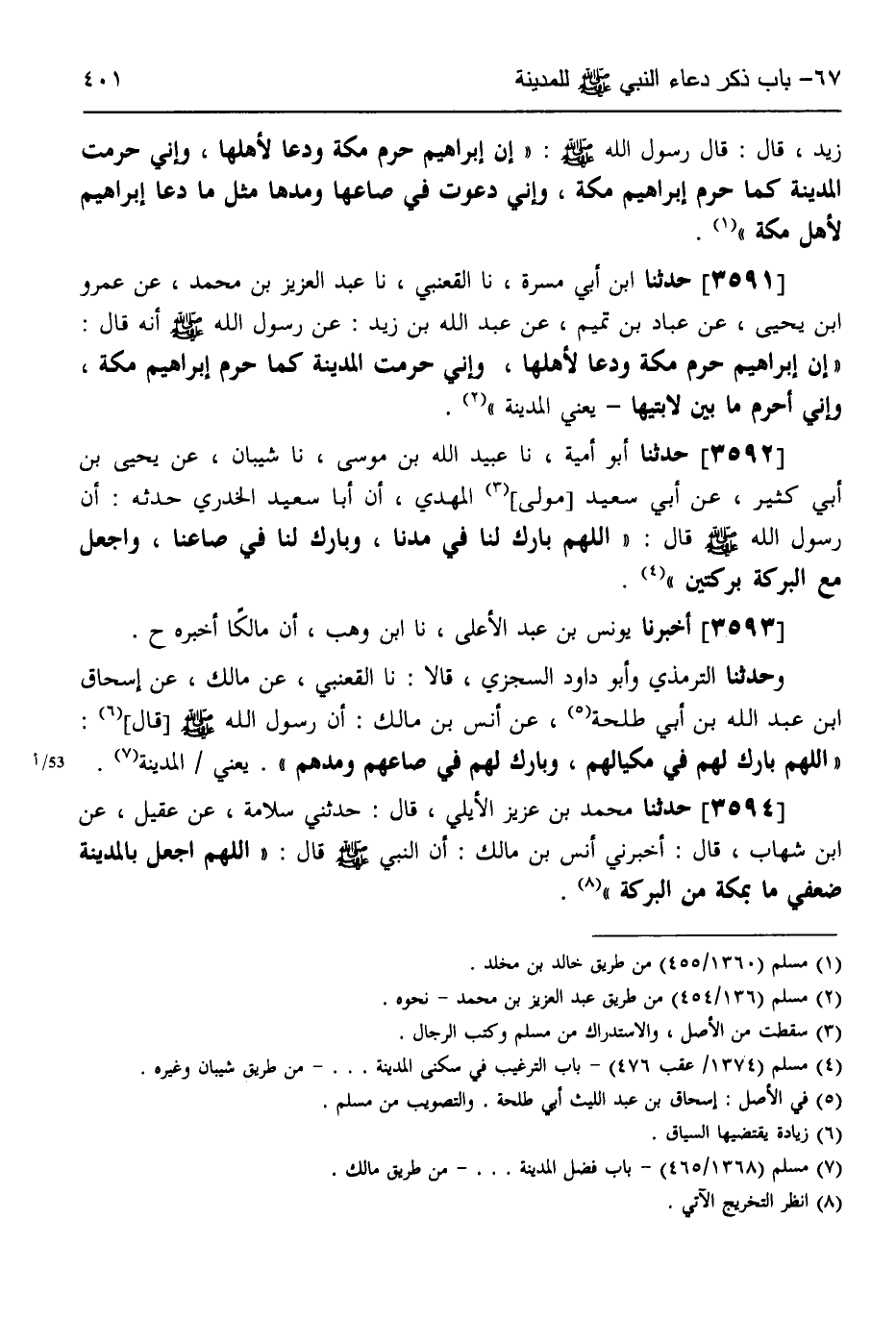 3591 - حَدَّثَنَا ابْنُ أَبِي مَسَرَّةَ، نَا الْقَعْنَبِيُّ، نَا عَبْدُ الْعَزِيزِ بْنُ مُحَمَّدٍ، عَنْ عَمْرِو بْنِ يَحْيَى، عَنْ عَبَّادِ بْنِ تَمِيمٍ،، عَنْ عَبْدِ اللَّهِ بْنِ زَيْدٍ، عَنْ رَسُولِ اللَّهِ صَلَّى اللهُ عَلَيْهِ وَسَلَّمَ أَنَّهُ قَالَ: «إِنَّ §إِبْرَاهِيمَ حَرَّمَ مَكَّةَ وَدَعَا لِأَهْلِهَا، وَإِنِّي حَرَّمْتُ الْمَدِينَةَ كَمَا حَرَّمَ إِبْرَاهِيمُ مَكَّةَ، وَإِنِّي أُحَرِّمُ مَا بَيْنَ لَابَتَيْهَا» يَعْنِي الْمَدِينَةَ