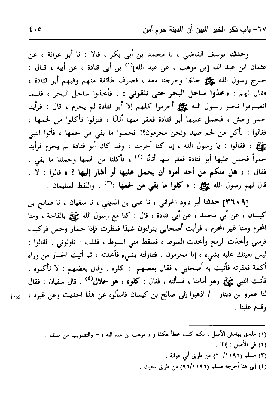 3609 - حَدَّثَنَا أَبُو دَاوُدَ الْحَرَّانِيَّ، نَا عَلِيُّ بْنُ الْمَدِينِيِّ، نَا سُفْيَانُ، نَا صَالِحُ بْنُ كَيْسَانَ، عَنْ أَبِي مُحَمَّدٍ،، عَنْ أَبِي قَتَادَةَ قَالَ: كُنَّا مَعَ رَسُولِ اللَّهِ صَلَّى اللهُ عَلَيْهِ وَسَلَّمَ بِالْقَاحَةِ وَمِنَّا الْمُحْرِمُ وَمِنَّا غَيْرُ الْمُحْرِمِ، فَرَأَيْتُ أَصْحَابِي يَتَرَاءَوْنَ شَيْئًا فَنَظَرْتُ فَإِذَا حِمَارُ وَحْشٍ، فَرَكِبْتُ فَرَسِي وَأَخَذْتُ الرُّمْحَ وَأَخَذْتُ السَّوْطَ فَسَقَطَ مِنِّي السَّوْطُ، فَقُلْتُ: نَاوِلُونِي، فَقَالُوا: لَيْسَ نُعِينُكَ عَلَيْهِ بِشَيْءٍ، إِنَّا مُحْرِمُونَ، فَتَنَاوَلْتُهُ بِشَيْءٍ فَأَخَذْتُهُ، ثُمَّ أَتَيْتُ الْحِمَارَ مِنْ وَرَاءِ أَكَمَةٍ فَعَقَرْتُهُ، فَأَتَيْتُ بِهِ أَصْحَابِي، فَقَالَ بَعْضُهُمْ: كُلُوهُ، وَقَالَ بَعْضُهُمْ: لَا تَأْكُلُوهُ، فَأَتَيْتُ النَّبِيَّ صَلَّى اللهُ عَلَيْهِ وَسَلَّمَ وَهُوَ أَمَامَنَا فَسَأَلْتُهُ فَقَالَ: «§كُلُوهُ هُوَ حَلَالٌ» قَالَ سُفْيَانُ: فَقَالَ لَنَا عَمْرُو بْنُ دِينَارٍ: اذْهَبُوا إِلَى صَالِحِ بْنِ كَيْسَانَ فَاسْأَلُوهُ عَنْ هَذَا الْحَدِيثِ وَعَنْ غَيْرِهِ، وَقَدِمَ عَلَيْنَا