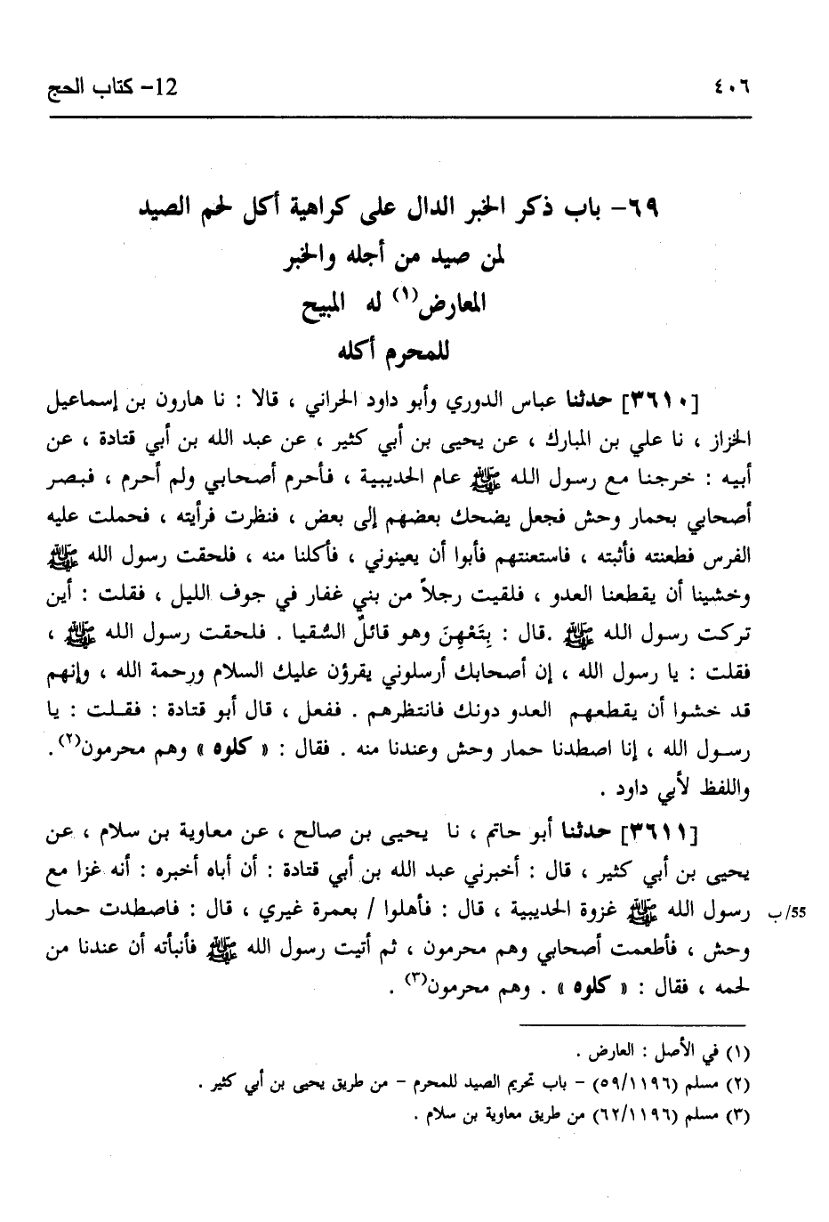 3611 - حَدَّثَنَا أَبُو حَاتِمٍ، نَا يَحْيَى بْنُ صَالِحٍ، عَنْ مُعَاوِيَةَ بْنِ سَلَّامٍ، عَنْ يَحْيَى بْنِ أَبِي كَثِيرٍ قَالَ: أَخْبَرَنِي عَبْدُ اللَّهِ بْنُ أَبِي قَتَادَةَ، أَنَّ أَبَاهُ أَخْبَرَهُ، أَنَّهُ غَزَا مَعَ رَسُولِ اللَّهِ صَلَّى اللهُ عَلَيْهِ وَسَلَّمَ غَزْوَةَ الْحُدَيْبِيَةِ قَالَ: فَأَهَلُّوا بِعُمْرَةٍ غَيْرِي، فَقَالَ: فَاصْطَدْتُ حِمَارَ وَحْشٍ، فَأَطْعَمْتُ أَصْحَابِي وَهُمْ مُحْرِمُونَ، ثُمَّ أَتَيْتُ رَسُولَ اللَّهِ صَلَّى اللهُ عَلَيْهِ وَسَلَّمَ فَأَنْبَأْتُهُ أَنَّ عِنْدَنَا مِنْ لَحْمِهِ، فَقَالَ: «§كُلُوهُ» وَهُمْ مُحْرِمُونَ