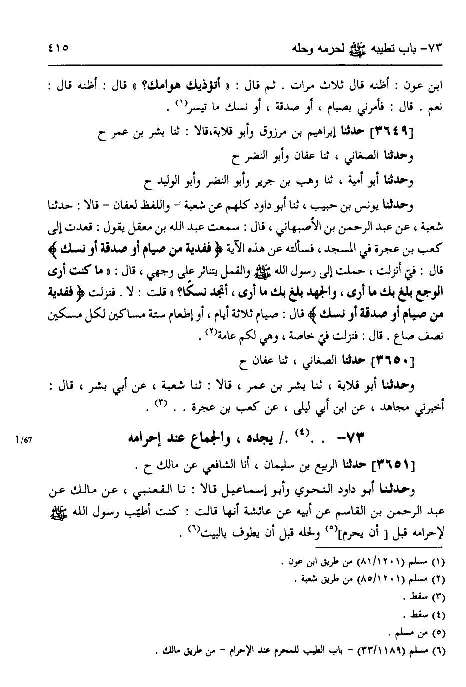 3649 - حَدَّثَنَا إِبْرَاهِيمُ بْنُ مَرْزُوقٍ، وَأَبُو قِلَابَةَ قَالَا: ثَنَا بِشْرُ بْنُ عُمَرَ، ح وَحَدَّثَنَا الصَّغَانِيُّ، ثَنَا عَفَّانُ، وَأَبُو النَّضْرِ، ح وَحَدَّثَنَا أَبُو أُمَيَّةَ، ثَنَا وَهْبُ بْنُ جَرِيرٍ، وَأَبُو النَّضْرِ، وَأَبُو الْوَلِيدِ، ح وَحَدَّثَنَا يُونُسُ بْنُ حَبِيبٍ، ثَنَا أَبُو دَاوُدَ كُلُّهُمْ، عَنْ شُعْبَةَ، وَاللَّفْظُ لِعَفَّانَ قَالَا: حَدَّثَنَا شُعْبَةُ، عَنْ عَبْدِ الرَّحْمَنِ بْنِ الْأَصْبَهَانِيِّ قَالَ: سَمِعْتُ عَبْدَ اللَّهِ بْنَ مَعْقِلٍ يَقُولُ: قَعَدْتُ إِلَى كَعْبِ بْنِ عُجْرَةَ فِي الْمَسْجِدِ فَسَأَلْتُهُ عَنْ هَذِهِ الْآيَةِ: {فَفِدْيَةٌ مِنْ صِيَامٍ أَوْ صَدَقَةٍ أَوْ نُسُكٍ} [البقرة: 196] ، قَالَ: فِيَّ أُنْزِلَتْ، حُمِلْتُ إِلَى رَسُولِ اللَّهِ صَلَّى اللهُ عَلَيْهِ وَسَلَّمَ وَالْقَمْلُ يَتَنَاثَرُ عَلَى وَجْهِي، قَالَ: «§مَا كُنْتُ أَرَى الْوَجَعَ بَلَغَ بِكَ مَا أَرَى وَالْجَهْدَ بَلَغَ بِكَ مَا أَرَى، أَتَجِدُ نُسُكًا؟» قُلْتُ: لَا، فَنَزَلَتْ {فَفِدْيَةٌ مِنْ صِيَامٍ أَوْ صَدَقَةٍ أَوْ نُسُكٍ} [البقرة: 196] ، قَالَ: صِيَامُ ثَلَاثَةِ أَيَّامٍ، أَوْ إِطْعَامُ سِتَّةِ مَسَاكِينَ لِكُلِّ مِسْكِينٍ نِصْفُ صَاعٍ، قَالَ: فَنَزَلَتْ فِيَّ خَاصَّةً وَهِيَ لَكُمْ عَامَّةٌ،