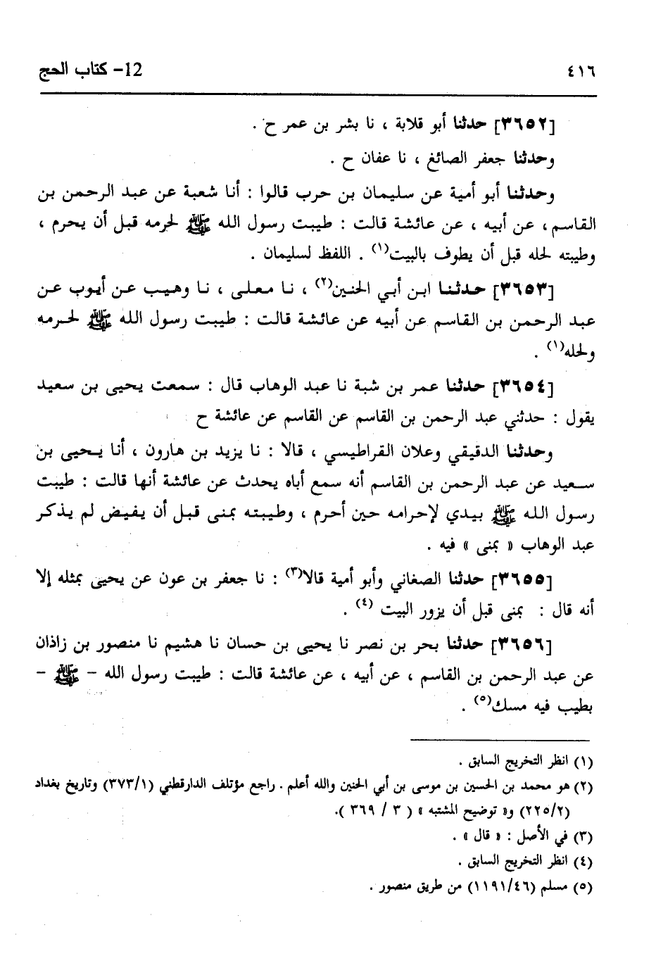 3652 - حَدَّثَنَا أَبُو قِلَابَةَ، نَا بِشْرُ بْنُ عُمَرَ، ح وَحَدَّثَنَا جَعْفَرٌ الصَّائِغُ، نَا عَفَّانُ، ح وَحَدَّثَنَا أَبُو أُمَيَّةَ، عَنْ سُلَيْمَانَ بْنِ حَرْبٍ قَالُوا: أَنَا شُعْبَةُ، عَنْ عَبْدِ الرَّحْمَنِ بْنِ الْقَاسِمِ، عَنْ أَبِيهِ،، عَنْ عَائِشَةَ قَالَتْ: «§طَيَّبْتُ رَسُولَ اللَّهِ صَلَّى اللهُ عَلَيْهِ وَسَلَّمَ لِحُرْمِهِ قَبْلَ أَنْ يُحْرِمَ وَطَيَّبْتُهُ لِحِلِّهِ قَبْلَ أَنْ يَطُوفَ بِالْبَيْتِ» اللَّفْظُ لِسُلَيْمَانَ