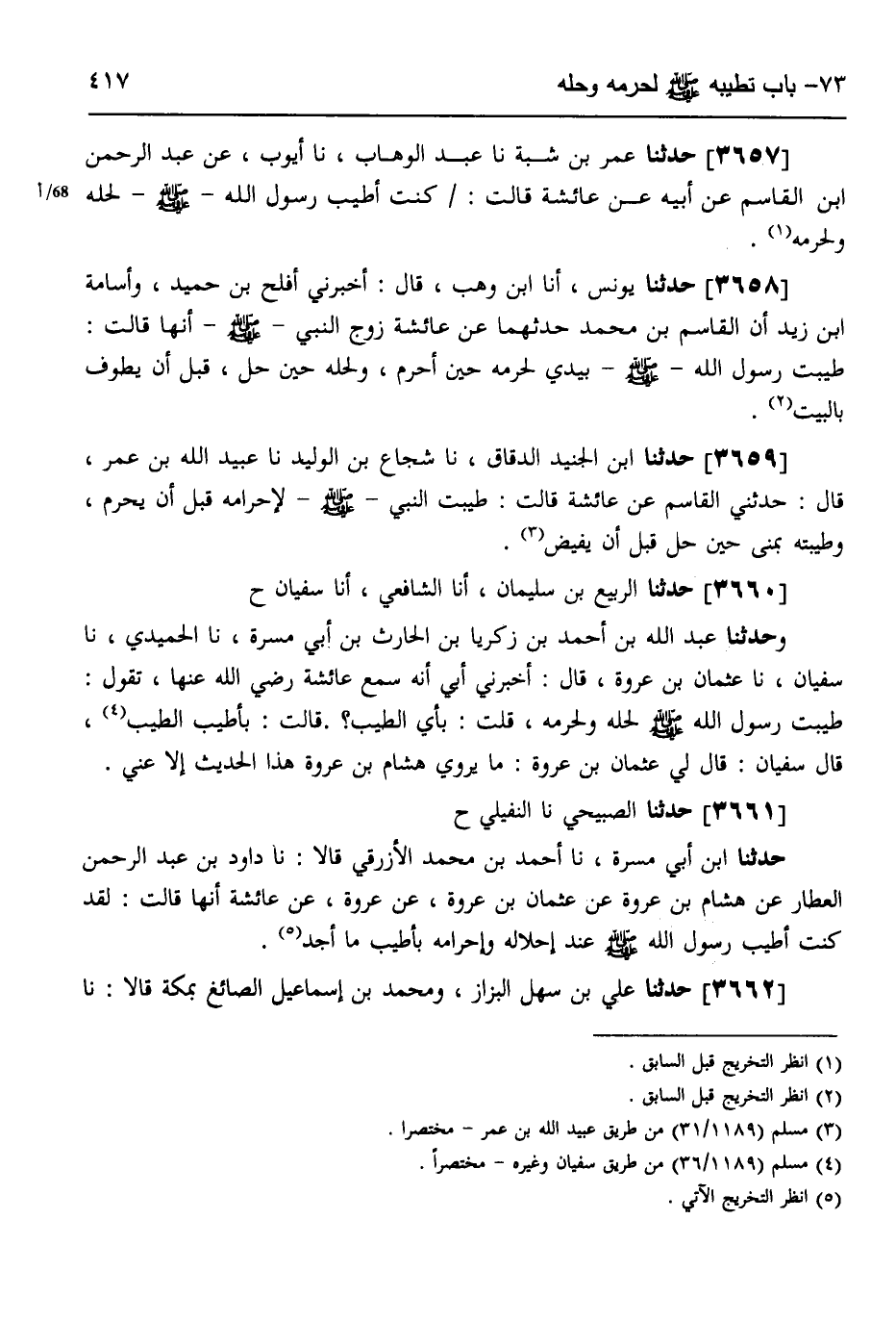 3661 - حَدَّثَنَا الصَّبِيحِيُّ، نَا النُّفَيْلِيُّ، ح حَدَّثَنَا ابْنُ أَبِي مَسَرَّةَ، نَا أَحْمَدُ بْنُ مُحَمَّدٍ الْأَزْرَقِيُّ، قَالَا: نَا دَاوُدُ بْنُ عَبْدِ الرَّحْمَنِ الْعَطَّارُ، عَنْ هِشَامِ بْنِ عُرْوَةَ، عَنْ عُثْمَانَ بْنِ عُرْوَةَ، عَنْ عُرْوَةَ،، عَنْ عَائِشَةَ أَنَّهَا قَالَتْ: «لَقَدْ كُنْتُ §أُطَيِّبُ رَسُولَ اللَّهِ صَلَّى اللهُ عَلَيْهِ وَسَلَّمَ عِنْدَ إِحْلَالِهِ وَإِحْرَامِهِ بِأَطْيَبِ مَا أَجِدُ»