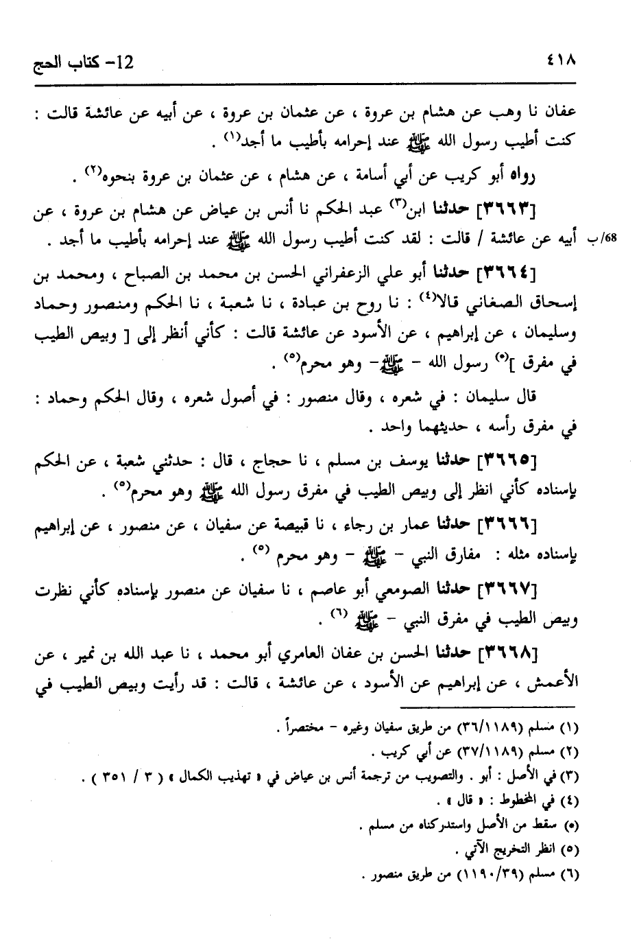 3665 - حَدَّثَنَا يُوسُفُ بْنُ مُسْلِمٍ، نَا حَجَّاجٌ، قَالَ: حَدَّثَنِي شُعْبَةُ، عَنِ الْحَكَمِ، بِإِسْنَادِهِ: «كَأَنِّي §أَنْظُرُ إِلَى وَبِيصِ الطِّيبِ فِي مَفْرِقِ رَسُولِ اللَّهِ صَلَّى اللهُ عَلَيْهِ وَسَلَّمَ وَهُوَ مُحْرِمٌ»