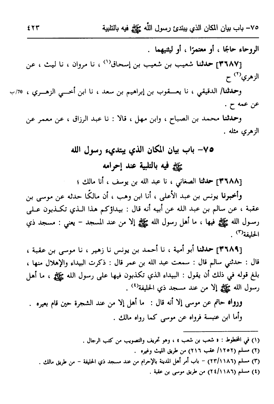 3688 - حَدَّثَنَا الصَّغَانِيُّ، نَا عَبْدُ اللَّهِ بْنُ يُوسُفَ، أَنَا مَالِكٌ، وَأَخْبَرَنَا يُونُسُ بْنُ عَبْدِ الْأَعْلَى، أَنَا ابْنُ وَهْبٍ، أَنَّ مَالِكًا حَدَّثَهُ، عَنْ مُوسَى بْنِ عُقْبَةَ، عَنْ سَالِمِ بْنِ عَبْدِ اللَّهِ، عَنْ أَبِيهِ أَنَّهُ قَالَ: بَيْدَاؤُكُمْ هَذَا الَّذِي تَكْذِبُونَ عَلَى رَسُولِ اللَّهِ صَلَّى اللهُ عَلَيْهِ وَسَلَّمَ فِيهَا «§مَا أَهَلَّ رَسُولُ اللَّهِ صَلَّى اللهُ عَلَيْهِ وَسَلَّمَ إِلَّا مِنْ عِنْدِ الْمَسْجِدِ» يَعْنِي: مَسْجِدَ ذِي الْحُلَيْفَةِ
