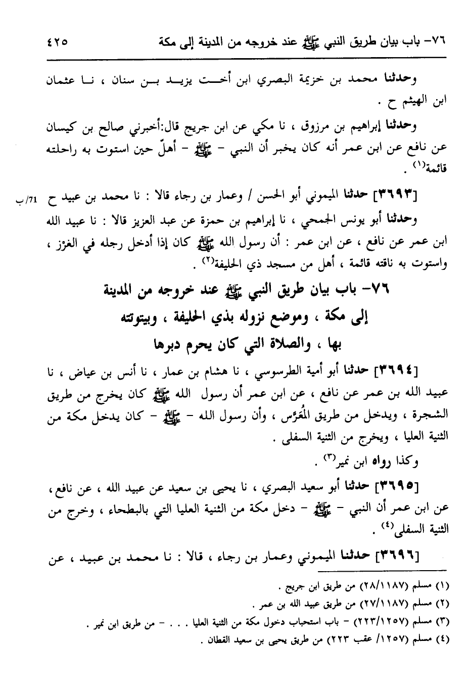3694 - حَدَّثَنَا أَبُو أُمَيَّةَ الطَّرَسُوسِيُّ، نَا هِشَامُ بْنُ عَمَّارٍ، نَا أَنَسُ بْنُ عِيَاضٍ، نَا عُبَيْدُ اللَّهِ بْنُ عُمَرَ، عَنْ نَافِعٍ،، عَنِ ابْنِ عُمَرَ «أَنَّ رَسُولَ اللَّهِ صَلَّى اللهُ عَلَيْهِ وَسَلَّمَ كَانَ §يَخْرُجُ مِنْ طَرِيقِ الشَّجَرَةِ وَيَدْخُلُ مِنْ طَرِيقِ الْمُعَرَّسِ، وَأَنَّ رَسُولَ اللَّهِ صَلَّى اللهُ عَلَيْهِ وَسَلَّمَ كَانَ يَدْخُلُ مَكَّةَ مِنَ الثَّنِيَّةِ الْعُلْيَا وَيَخْرُجُ مِنَ الثَّنِيَّةِ السُّفْلَى» وَكَذَا رَوَاهُ ابْنُ نُمَيْرٍ