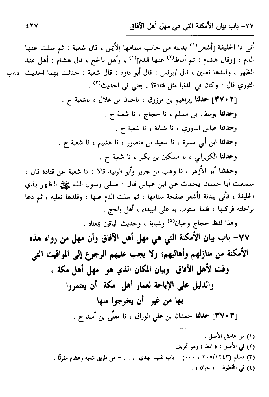 3702 - حَدَّثَنَا إِبْرَاهِيمُ بْنُ مَرْزُوقٍ، نَا حَبَّانُ بْنُ هِلَالٍ، نَا شُعْبَةُ، ح وَحَدَّثَنَا يُوسُفُ بْنُ مُسْلِمٍ، نَا حَجَّاجٌ، نَا شُعْبَةُ، ح وَحَدَّثَنَا عَبَّاسٌ الدُّورِيُّ، نَا شَبَابَةُ، نَا شُعْبَةُ، ح وَحَدَّثَنَا ابْنُ أَبِي مَسَرَّةَ، نَا سَعِيدُ بْنُ مَنْصُورٍ، نَا هُشَيْمٌ، نَا شُعْبَةُ، ح وَحَدَّثَنَا الْكُزْبُرَانِيُّ، نَا مِسْكِينُ بْنُ بُكَيْرٍ، نَا شُعْبَةُ، ح وَحَدَّثَنَا أَبُو الْأَزْهَرِ، نَا وَهْبُ بْنُ جَرِيرٍ، وَأَبُو الْوَلِيدِ، قَالَا: نَا شُعْبَةُ، عَنْ قَتَادَةَ قَالَ: سَمِعْتُ أَبَا حَسَّانَ يُحَدِّثُ،، عَنِ ابْنِ عَبَّاسٍ قَالَ: «§صَلَّى رَسُولُ اللَّهِ صَلَّى اللهُ عَلَيْهِ وَسَلَّمَ الظُّهْرَ بِذِي الْحُلَيْفَةِ فَأُتِيَ بِبَدَنَةٍ فَأَشْعَرَ صَفْحَةَ سَنَامِهَا، ثُمَّ سَلَتَ الدَّمَ عَنْهَا وَقَلَّدَهَا نَعْلَيْهِ، ثُمَّ دَعَا بِرَاحِلَتِهِ فَرَكِبَهَا فَلَمَّا اسْتَوَتْ بِهِ عَلَى الْبَيْدَاءِ أَهَلَّ بِالْحَجِّ» وَهَذَا لَفْظُ حَجَّاجٍ وَحَبَّانَ وَشَبَابَةَ، وَحَدِيثُ الْبَاقِينَ بِمَعْنَاهُ