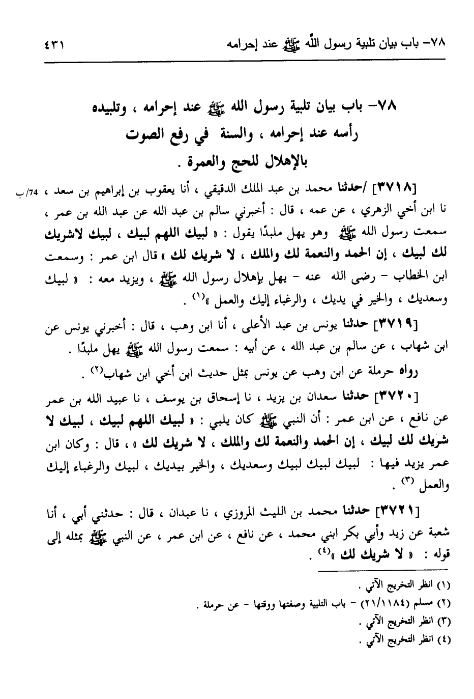 3720 - حَدَّثَنَا سَعْدَانُ بْنُ يَزِيدَ، نَا إِسْحَاقُ بْنُ يُوسُفَ، نَا عُبَيْدُ اللَّهِ بْنُ عُمَرَ، عَنْ نَافِعٍ،، عَنِ ابْنِ عُمَرَ، أَنَّ النَّبِيَّ صَلَّى اللهُ عَلَيْهِ وَسَلَّمَ كَانَ يُلَبِّي: «§لَبَّيْكَ اللَّهُمْ لَبَّيْكَ، لَبَّيْكَ لَا شَرِيكَ لَكَ لَبَّيْكَ، إِنَّ الْحَمْدَ وَالنِّعْمَةَ لَكَ وَالْمُلْكَ، لَا شَرِيكَ لَكَ» قَالَ: وَكَانَ ابْنُ عُمَرَ يَزِيدُ فِيهَا: لَبَّيْكَ لَبَّيْكَ لَبَّيْكَ وَسَعْدَيْكَ، وَالْخَيْرُ بِيَدَيْكَ، لَبَّيْكَ وَالرَّغْبَاءُ إِلَيْكَ وَالْعَمَلُ،