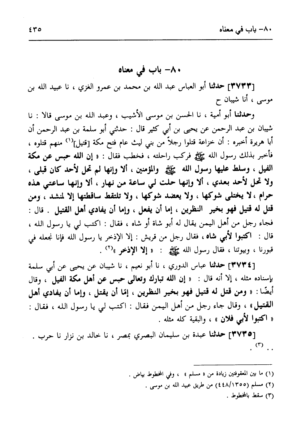 3733- حَدَّثَنَا أَبُو الْعَبَّاسِ عَبْدُ اللهِ بْنُ مُحَمَّدِ بْنِ عَمْرٍو الْغَزِّيُّ ، حَدَّثَنَا عُبَيْدُ اللهِ بْنُ مُوسَى ، أَخْبَرنَا شَيْبَانُ (ح) وَحَدَّثَنَا أَبُو أُمَيَّةَ ، حَدَّثَنَا الْحَسَنُ بْنُ مُوسَى الأَشْيَبُ ، وَعُبَيْدُ اللهِ بْنُ مُوسَى ، قَالاَ : حَدَّثَنَا شَيْبَانُ بْنُ عَبْدِ الرَّحْمَنِ ، عَنْ يَحْيَى بْنِ أَبِي كَثِيرٍ قَالَ : حَدَّثَنِي أَبُو سَلَمَةَ بْنُ عَبْدِ الرَّحْمَنِ ، أَنَّ أَبَا هُرَيْرَةَ أَخْبَرَهُ ، أَنَّ خُزَاعَةَ قَتَلُوا رَجُلاً مِنْ بَنِي لَيْثٍ عَامَ فَتْحِ مَكَّةَ بِقَتِيلٍ مِنْهُمْ قَتَلُوهُ ، فَأُخْبِرَ بِذَلِكَ رَسُولُ اللهِ صَلَّى اللهُ عَلَيهِ وَسَلَّمَ , فَرَكِبَ رَاحِلَتَهُ فَخَطَبَ فَقَالَ : إِنَّ اللَّهَ حَبَسَ عَنْ مَكَّةَ الْفِيلَ ، وَسَلَّطَ عَلَيْهَا رَسُولَ اللهِ صَلَّى اللهُ عَلَيهِ وَسَلَّمَ وَالْمُؤْمِنِينَ ، أَلا وَإِنَّهَا لَمْ تَحِلَّ لأَحَدٍ كَانَ قَبْلِي ، وَلاَ تَحِلُّ لأَحَدٍ بَعْدِي ، أَلا وَإِنَّهَا حَلَّتْ لِي سَاعَةً مِنْ نَهَارٍ ، أَلا وَإِنَّهَا سَاعَتِي هَذِهِ حَرَامٌ ، لاَ يُخْتَلَى شَوْكُهَا ، وَلاَ يُعْضَدُ شَوْكُهَا ، وَلاَ تُلْتَقَطُ سَاقِطَتُهَا إِلاَّ لِمُنْشِدٍ ، وَمَنْ قُتِلَ لَهُ قَتِيلٌ فَهُوَ بِخَيْرِ النَّظَرَيْنِ ، إِمَّا أَنْ يَفْعَلَ ، وَإِمَّا أَنْ يُفَادِيَ أَهْلَ الْقَتِيلِ قَالَ : فَجَاءَ رَجُلٌ مِنْ أَهْلِ الْيَمَنِ يُقَالُ لَهُ : أَبُو شَاةٍ ، أَوْ شَاهٍ ، فَقَالَ : اكْتُبْ لِي يَا رَسُولَ اللهِ ، قَالَ : اكْتُبُوا لأَبِي شَاهٍ فَقَالَ رَجُلٌ مِنْ قُرَيْشٍ : إِلاَّ الإِذْخِرَ يَا رَسُولَ اللهِ ، فَإِنَّا نَجْعَلُهُ فِي قُبُورِنَا وَبُيُوتِنَا ، فَقَالَ رَسُولُ اللهِ صَلَّى اللهُ عَلَيهِ وَسَلَّمَ : إِلاَّ الإِذْخِرَ.