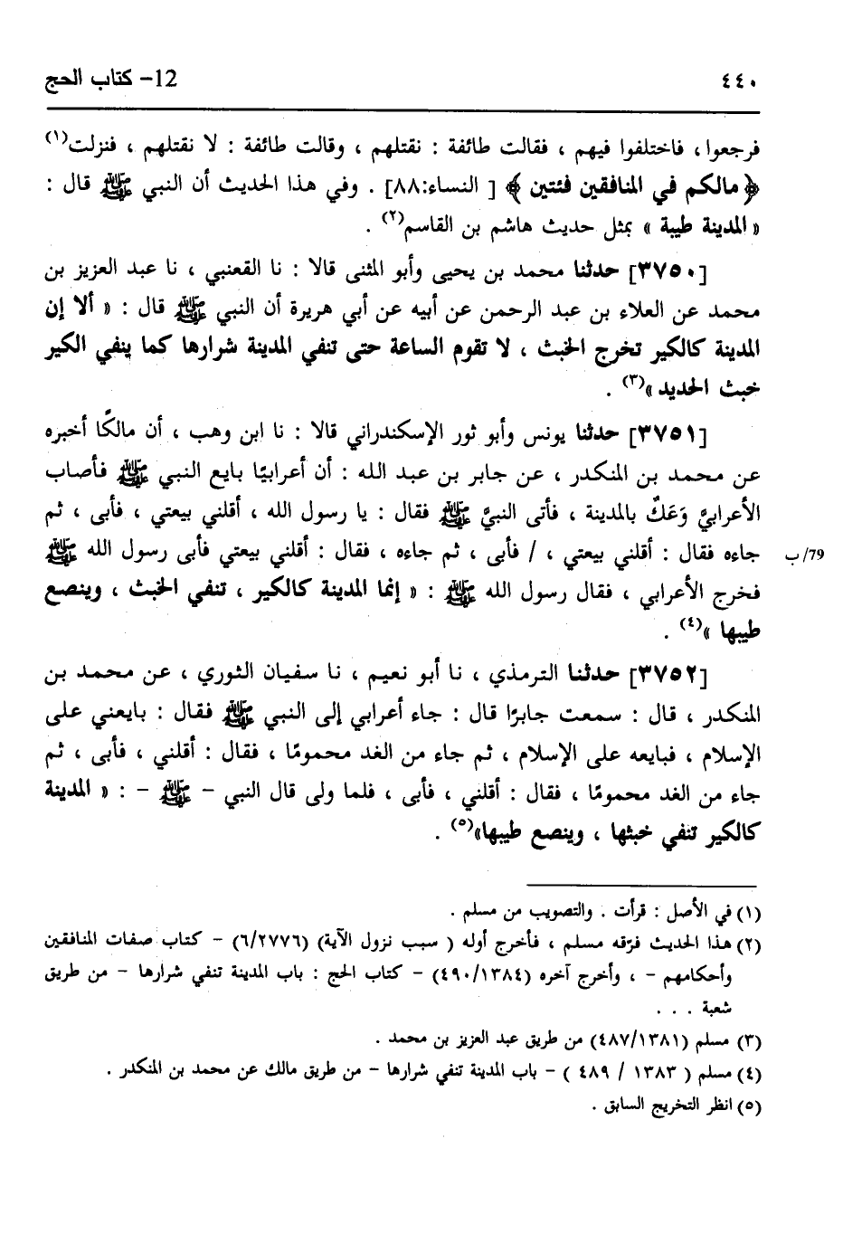 3752 - حَدَّثَنَا التِّرْمِذِيُّ، نَا أَبُو نُعَيْمٍ، نَا سُفْيَانُ الثَّوْرِيُّ، عَنْ مُحَمَّدِ بْنِ الْمُنْكَدِرِ قَالَ: سَمِعْتُ جَابِرًا قَالَ: جَاءَ أَعْرَابِيٌّ إِلَى النَّبِيِّ صَلَّى اللهُ عَلَيْهِ وَسَلَّمَ فَقَالَ: بَايِعْنِي عَلَى الْإِسْلَامِ، فَبَايَعَهُ عَلَى الْإِسْلَامِ، ثُمَّ جَاءَ مِنَ الْغَدِ مَحْمُومًا فَقَالَ: أَقِلْنِي، فَأَبَى، ثُمَّ جَاءَ مِنَ الْغَدِ مَحْمُومًا، فَقَالَ: أَقِلْنِي، فَأَبَى، فَلَمَّا وَلَّى قَالَ النَّبِيُّ صَلَّى اللهُ عَلَيْهِ وَسَلَّمَ: «§الْمَدِينَةُ كَالْكِيرِ تَنْفِي خَبَثَهَا وَيَنْصَعُ طِيبُهَا»