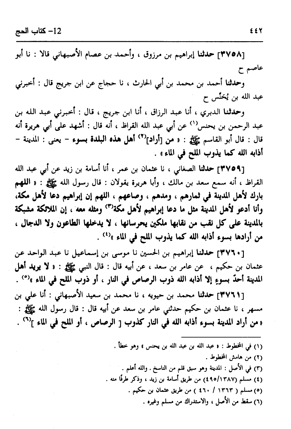 3758 - حَدَّثَنَا إِبْرَاهِيمُ بْنُ مَرْزُوقٍ، وَأَحْمَدُ بْنُ عِصَامٍ الْأَصْبَهَانِيُّ، قَالَا: نَا أَبُو عَاصِمٍ، ح وَحَدَّثَنَا أَحْمَدُ بْنُ مُحَمَّدِ بْنِ أَبِي الْحَارِثِ، نَا حَجَّاجٌ، عَنِ ابْنِ جُرَيْجٍ قَالَ: أَخْبَرَنِي عَبْدُ اللَّهِ بْنُ يُحَنَّسَ، ح وَحَدَّثَنَا الدَّبَرِيُّ، أَنَا عَبْدُ الرَّزَّاقِ، أَنَا ابْنُ جُرَيْجٍ، قَالَ: أَخْبَرَنِي عَبْدُ اللَّهِ بْنُ عَبْدِ الرَّحْمَنِ بْنِ يُحَنَّسَ، عَنْ أَبِي عَبْدِ اللَّهِ الْقَرَّاظِ، أَنَّهُ قَالَ: أَشْهَدُ عَلَى أَبِي هُرَيْرَةَ أَنَّهُ قَالَ: قَالَ أَبُو الْقَاسِمِ صَلَّى اللهُ عَلَيْهِ وَسَلَّمَ: «§مَنْ أَرَادَ أَهْلَ هَذِهِ الْبَلْدَةِ بِسُوءٍ - يَعْنِي الْمَدِينَةَ - أَذَابَهُ اللَّهُ كَمَا يَذُوبُ الْمِلْحُ فِي الْمَاءِ»