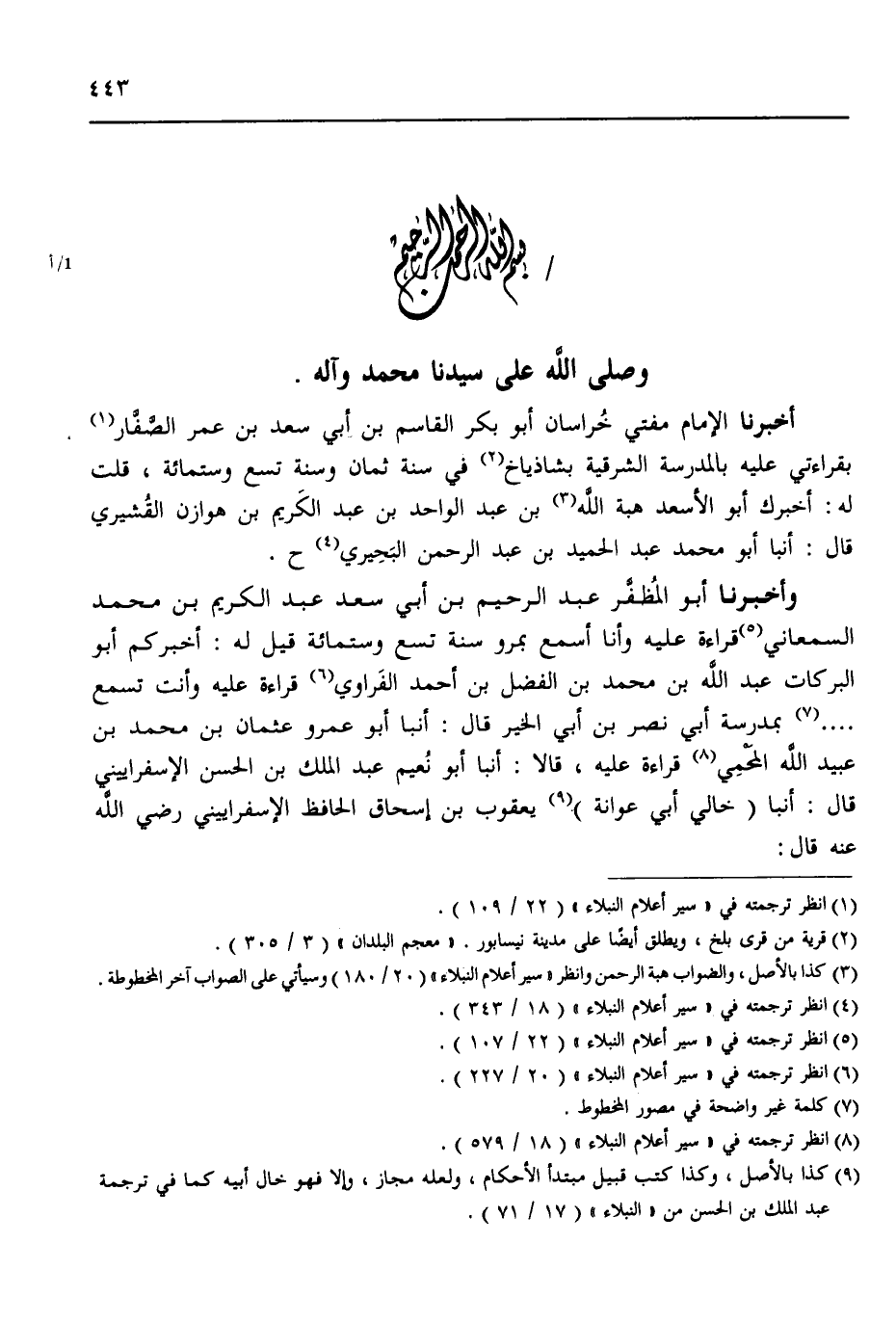 أَخْبَرَنَا الْإِمَامُ مُفْتِي خُرَاسَانَ أَبُو بَكْرٍ الْقَاسِمُ بْنُ أَبِي سَعْدِ بْنِ عُمَرَ الصَّفَّارُ بِقَرَاءَتِي عَلَيْهِ بِالْمَدْرَسَةِ الشَّرْقِيَّةِ بِشَاذْيَاخَ فِي سَنَةِ ثَمَانٍ وَسَنَةِ تِسْعٍ وَسِتِّمِائَةٍ قُلْتُ لَهُ أَخْبَرَكَ أَبُو الْأَسْعَدِ هِبَةُ اللَّهِ بْنُ عَبْدِ الْوَاحِدِ بْنِ عَبْدِ الْكَرِيمِ بْنِ هَوَازِنَ الْقُشَيْرِيُّ قَالَ: أَنْبَا أَبُو مُحَمَّدٍ عَبْدُ الْحَمْيِدِ بْنُ عَبْدِ الرَّحْمَنِ الْبُحَيْرِيُّ ح وَأَخْبَرَنَا أَبُو الْمُظَفَّرِ عَبْدُ الرَّحِيمِ بْنُ أَبِي سَعْدٍ عَبْدُ الْكَرِيمِ بْنُ مُحَمَّدٍ السَّمْعَانِيُّ قِرَاءَةً عَلَيْهِ وَأَنَا أَسْمَعُ بِمَرْوَ سَنَةَ تِسْعٍ وَسِتِّمِائَةٍ قِيلَ لَهُ أَخْبَرَكُمْ أَبُو الْبَرَكَاتِ عَبْدُ اللَّهِ بْنُ مُحَمَّدِ بْنِ الْفَضْلِ بْنِ أَحْمَدَ الْفَرَاوِيُّ قِرَاءَةً عَلَيْهِ وَأَنْتَ تَسْمَعُ بِمَدْرَسَةِ أَبِي نَصْرِ بْنِ أَبِي الْخَيْرِ قَالَ: أَنْبَا أَبُو عَمْرٍو عُثْمَانُ بْنُ مُحَمَّدِ بْنِ عُبَيْدِ اللَّهِ الْمَحْمِيُّ قِرَاءَةً عَلَيْهِ قَالَا: أَنْبَا أَبُو نُعَيْمٍ عَبْدُ الْمَلِكِ بْنُ الْحَسَنِ الْإِسْفَرَايِينِيُّ قَالَ: أَنْبَا خَالِي أَبُوعَوَانَةَ يَعْقُوبُ بْنُ إِسْحَاقَ الْحَافِظُ الْإِسْفَرَايِينِيُّ رَضِيَ اللَّهُ عَنْهُ قَالَ