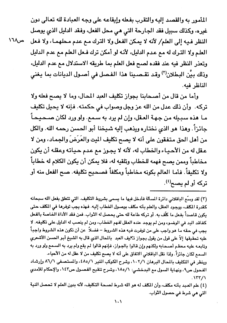 المأمور به والقصد إليه والتقرب بفعله وإيقاعه على وجه العبادة لله تعالى دون غيره، وكذلك سبيل فقد الجارحة التي هي محل الفعل، وفقد الدليل الذي يوصل النظر فيه إلى العلم/ ص ١٦٨ لأنه لا يمكن الفعل ولا الترك مع عدم محلهما، ولا فعل العلم ولا الترك له مع عدم الدليل، لأنه لو أمكن ترك فعل العلم مع عدم الدليل وتعذر النظر فيه عند فقده لصح فعل العلم بما طريقة الاستدلال مع عدم الدليل، وذلك بين البطلان وقد تقصينا هذا الفصل في أصول الديانات بما يغني الناظر فيه.