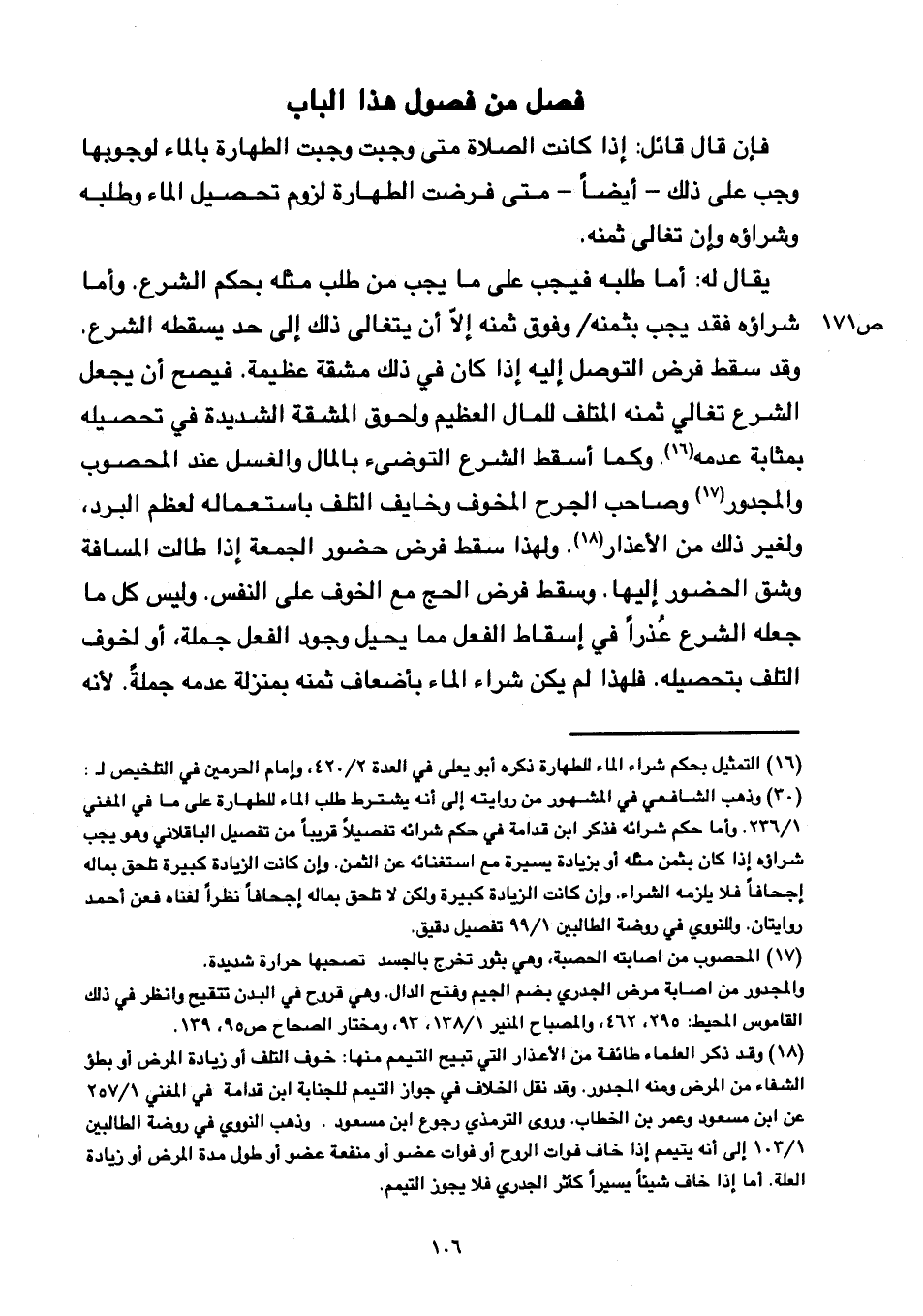 يقال له: أما طلبه فيجب على ما يجب من طلب مثله بحكم الشرع. وأما شراؤه فقد يجب بثمنه/ ص (١٧١) وفوق ثمنه إلا أن يتغالى ذلك إلى حد يسقطه الشرع. وقد سقط فرض التوصل إليه إذا كان في ذلك مشقةً عظيمةً. فيصح أن يجعل الشرع تغالي ثمنه المتلف للمال العظيم ولحوق المشقةً الشديدةً قي تحصيله بمثابة عدمه. وكما أسقط الشرع التوضيء بالمال والغسل عند المحصوب والمجدور وصاحب الجرح المخوف وخايف التلف باستعماله لعظم البرد، ولغير ذلك من الأعذار. ولهذا سقط فرض حضور الجمعة إذا طالت المسافة وسقط الحضور إليها. وسقط فرض الحج مع الخوف على النفس. وليس كل ما جعله الشرع عذرًا في إسقاط الفعل مما يحيل وجود الفعل جملةً، أو لخوف التلف بتحصيله. فلهذا لم يكن شراء الماء بأضعاف ثمنه بمنزلة عدمه جملةً؛ لأنه