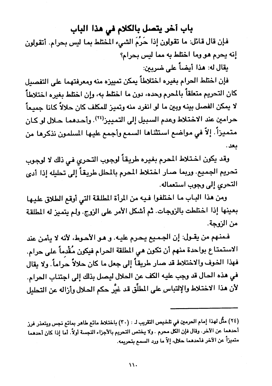 فإن اختلط الحرام بغيره اختلاطًا يمكن تمييزه منه ومعرفتها على التفصيل كان التحريم متعلقًا بالمحرم وحده، دون ما اختلط به، وإن اختلط بغيره اختلاطًا لا يمكن الفصل بينه وبين ما لو انفرد منه وتميز للمكلف كان حلالًا كانا جميعًا حرامين عند الاختلاط وعدم السبيل إلى التمييز. وأحدهما حلال لو كان متميزًا. إلا في مواضع استثناها السمع وأجمع عليها المسلمون نذكرها من بعد.