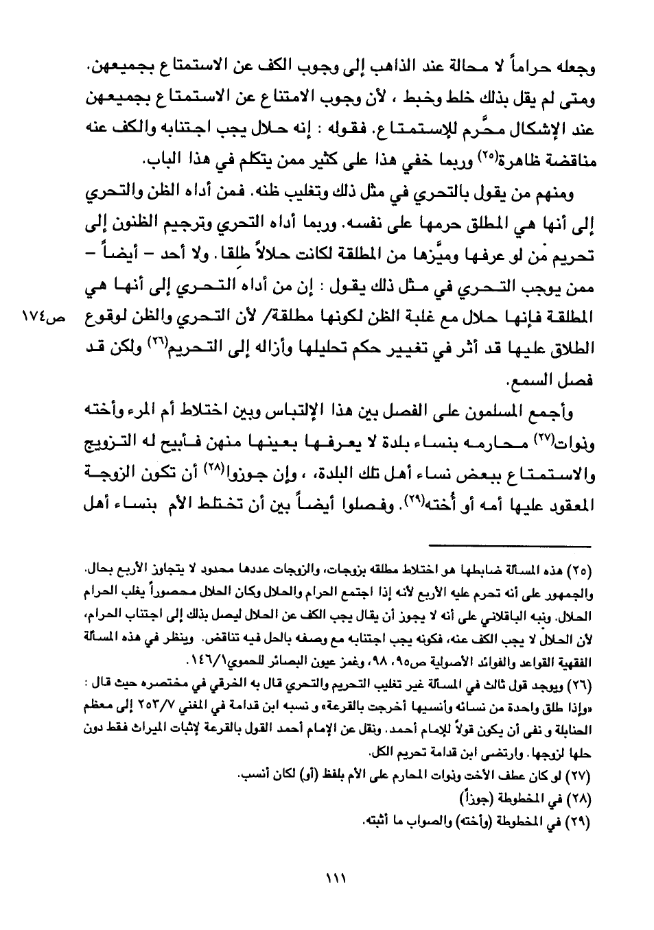 ومنهم من يقول بالتحري في مثل ذلك وتغليب ظنه. فمن أداه الظن والتحري إلى أنها هي المطلق حرمها على نفسه. وربما أداه التحري وترجي الظنون إلى تحريم من لو عرفها وميزها من المطلقة لكانت حلالاً طلقا. ولا أحد - أيضاً- ممن يوجب التحري في مثل ذلك يقول: إن من أداه التحري إلى أنها هي المطلقة فإنها حلال مع غلبة الظن لكونها مطلقة/ لأن التحري والظن لوقوع الطلاق عليها قد أثر في تغيير حكم تحليلها وأزاله إلى التحريم ولكن قد فصل السمع.