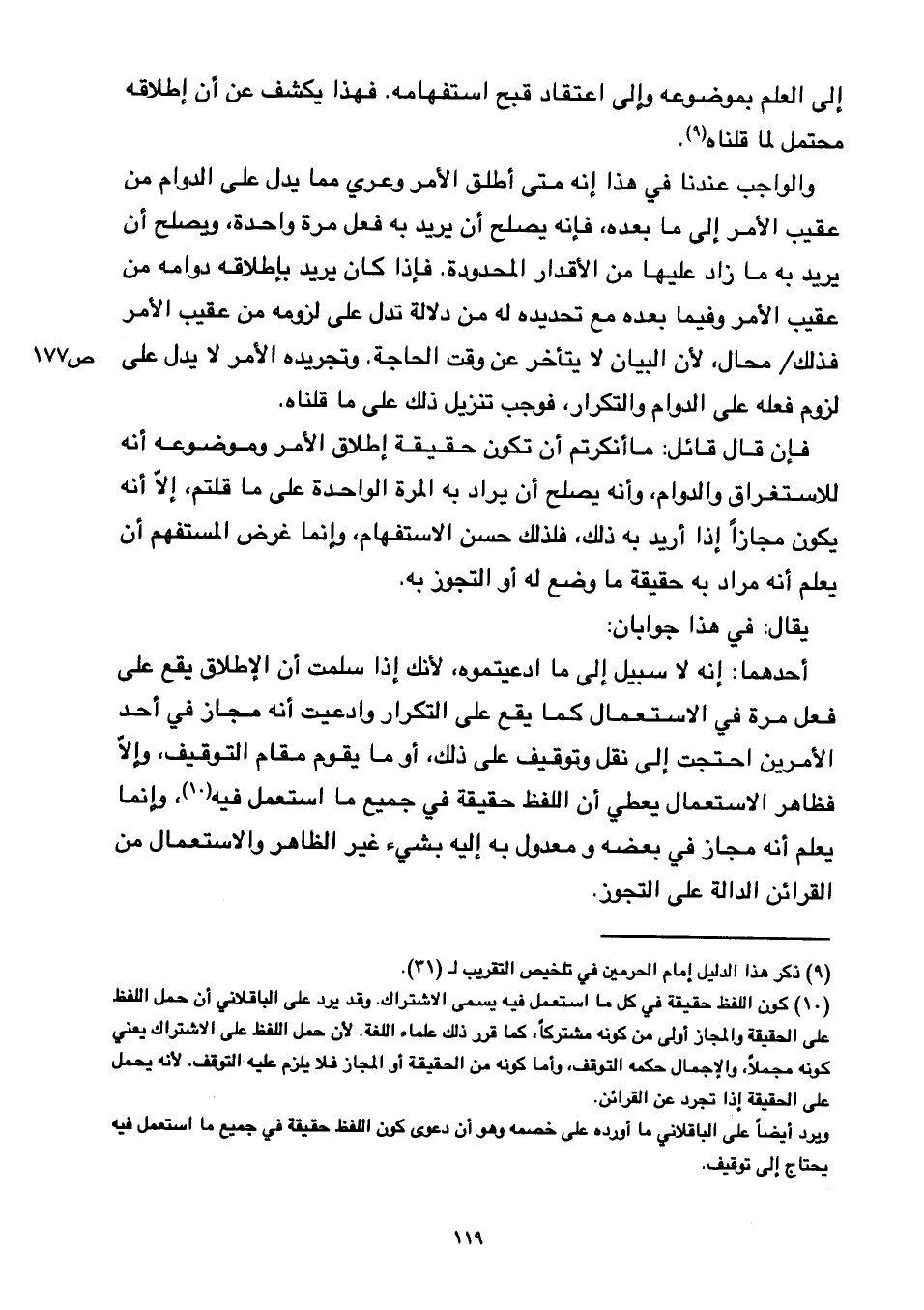 فإن قال قائل: ما أنكرتم أن تكون حقيقة إطلاق الأمر وموضوعه أنه للاستغراق والدوام، وأنه يصلح أن يراد به المرة الواحدة علي ما قلتم، إلا أنه يكون مجازاً إذا أريد به ذلك، فلذلك حسن الاستفهام، وإنما عرض المستفهم أن يعلم أنه مراد به حقيقة ما وضع له أو التجوز به.