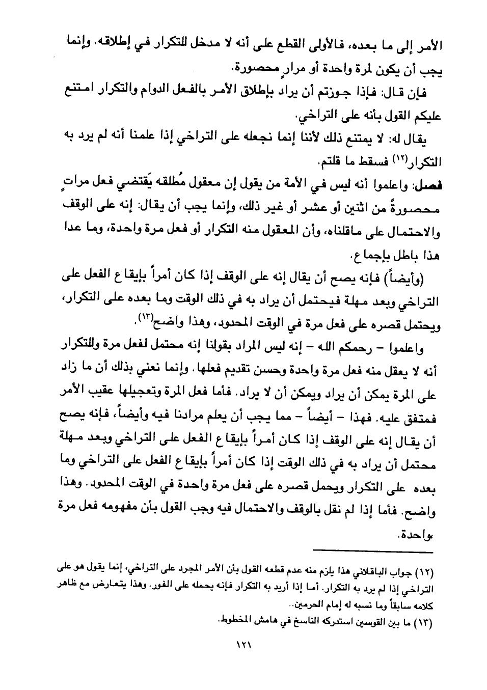 واعلموا - رحمكم الله - إنه ليس المراد بقولنا إنه محتمل لفعل مرة وللتكرار أنه لا يعقل منه مرة واحدة وحسن تقديم فعلها. وإنما نعني بذلك أن ما زاد على المرة يمكن أن يراد ويمكن أن لا يراد. فأما فعل المرة وتعجيلها عقب الأمر فمتفق عليه. فهذا - أيضاً- مما يجب أم يعلم مرادنا فيه وأيضاً، فإنه يصح أن يقال إنه على الوقف إذا كان أمراً بإيقاع الفعل على التراخي وبعد مهلة محتمل أن يراد به في ذلك الوقت إذا كان أمراً بإيقاع الفعل على التراخي وما بعده على التكرار ويحمل قصره على فعل مرة واحدة في الوقت المحدود. وهذا واضح. فأما إذا لم نقل بالوقف والاحتمال فيه وجب القول بأن مفهومه فعل مرة، واحدة.